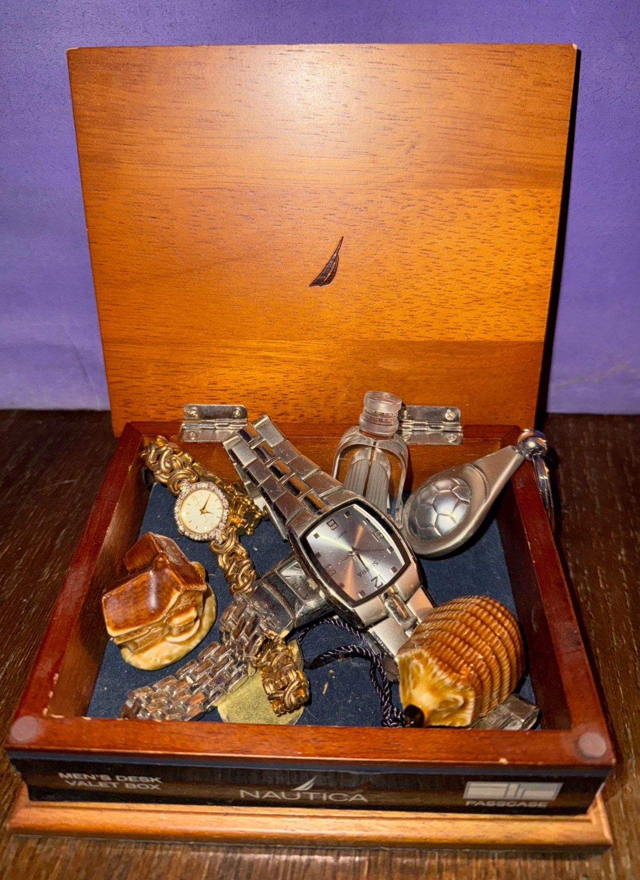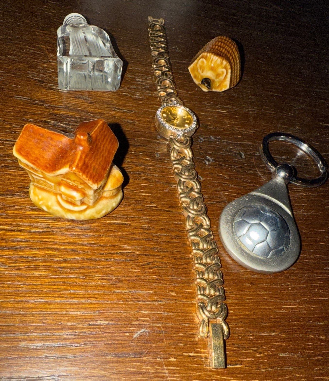 Box Of Vintage Treasures- Watches, Red Rose Mini's, & Keychain