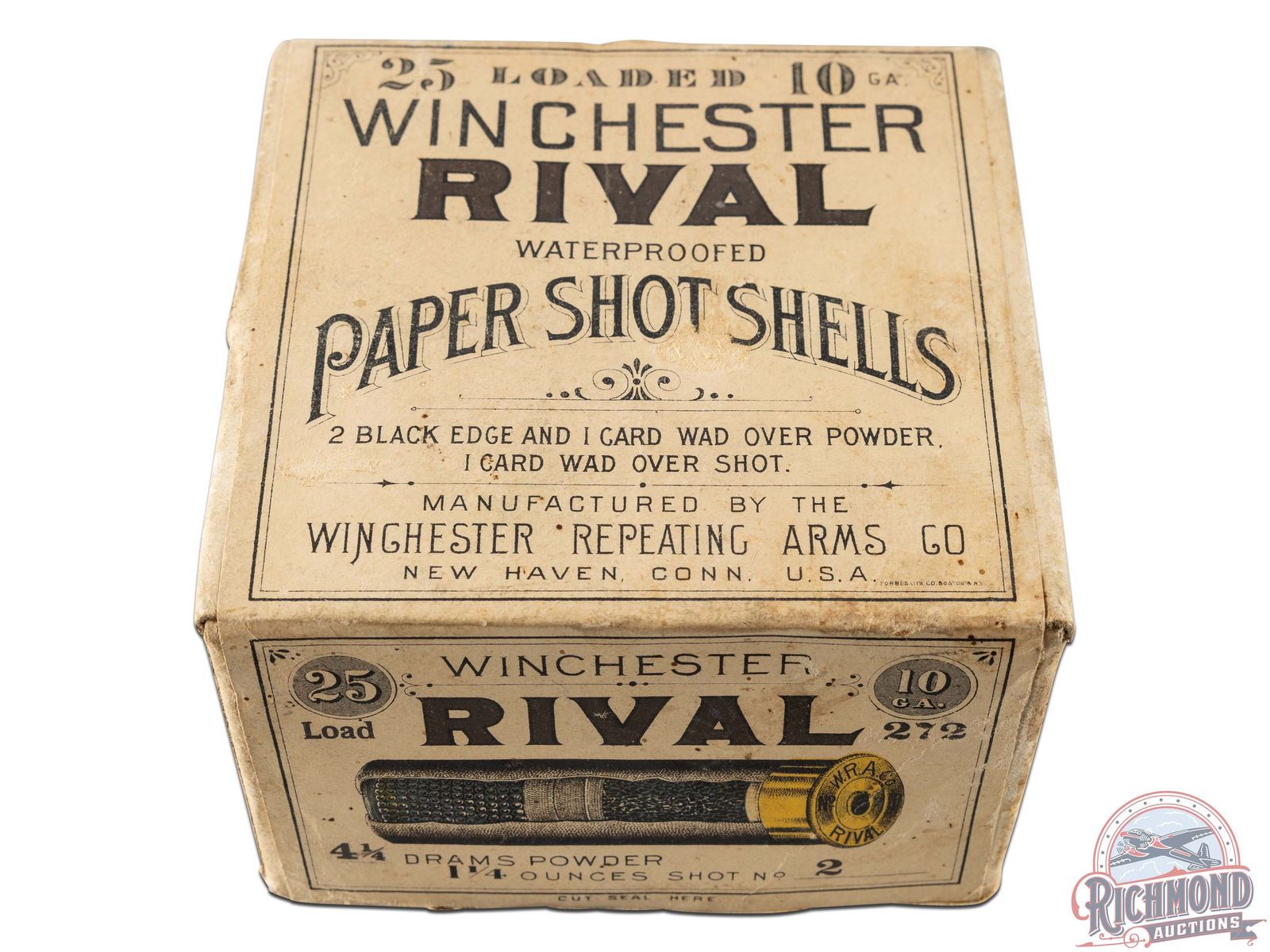 Listed as a "6" rarity in Bacyk's Shotshell Encyclopedia. Box is 25 round, 10 gauge, two-piece cardboard box with beige "Rival" label with "Paper Shot Shells" in a semi-circle with Winchester Address.