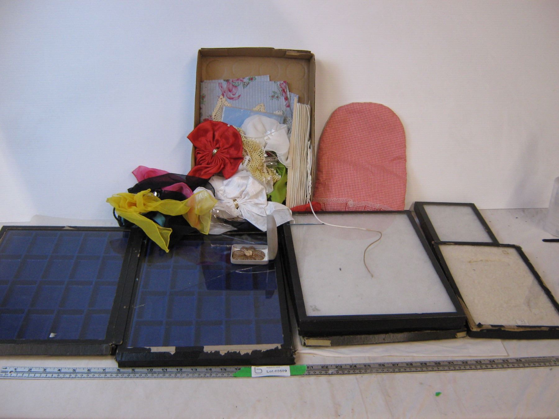 Box containing ring/earring/key display cases and box of ladies kerchiefs and doilies