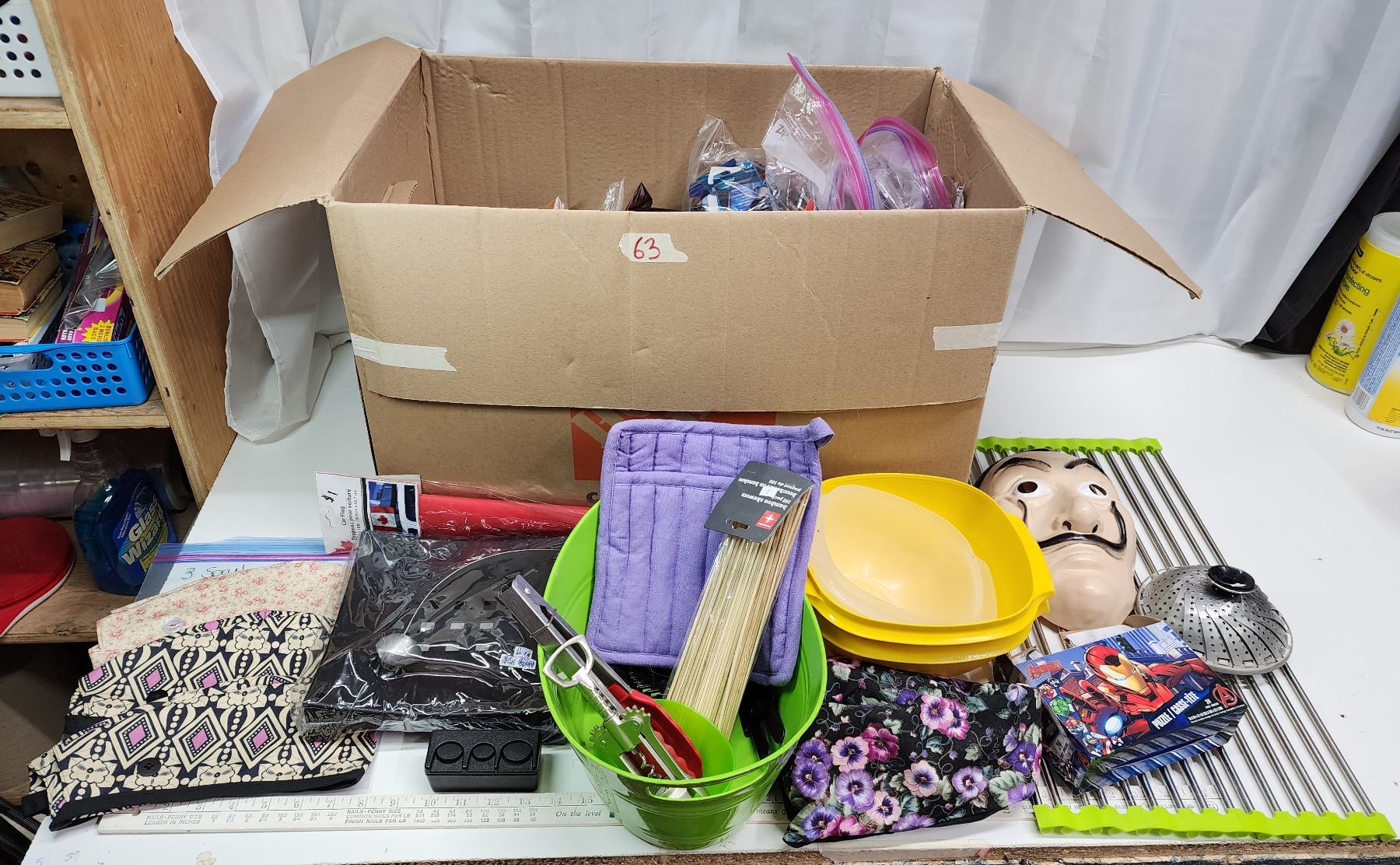 Box filled with large collection of items - Puzzles, kitchenwares, faucet and hose, Christmas décor,