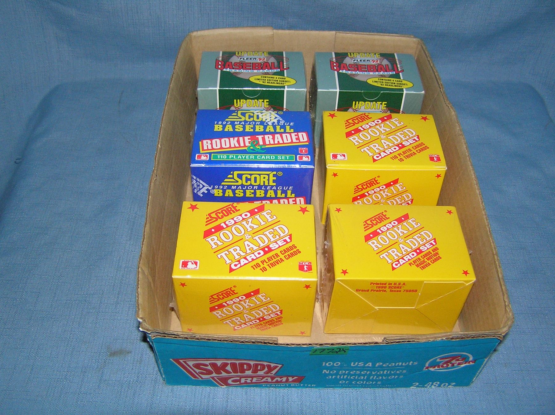 Box full of Fleer and Score traded factory sealed baseball card sets loaded with all stars and rookies est. value $200.00-$225.00