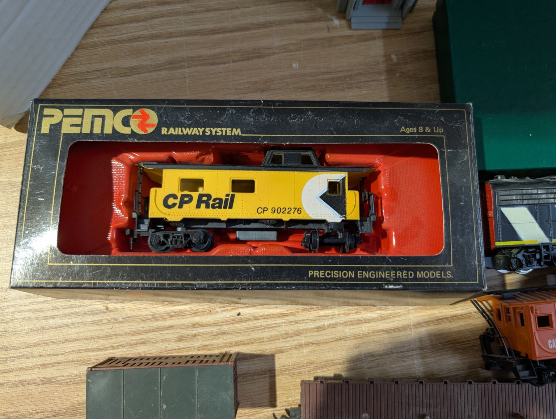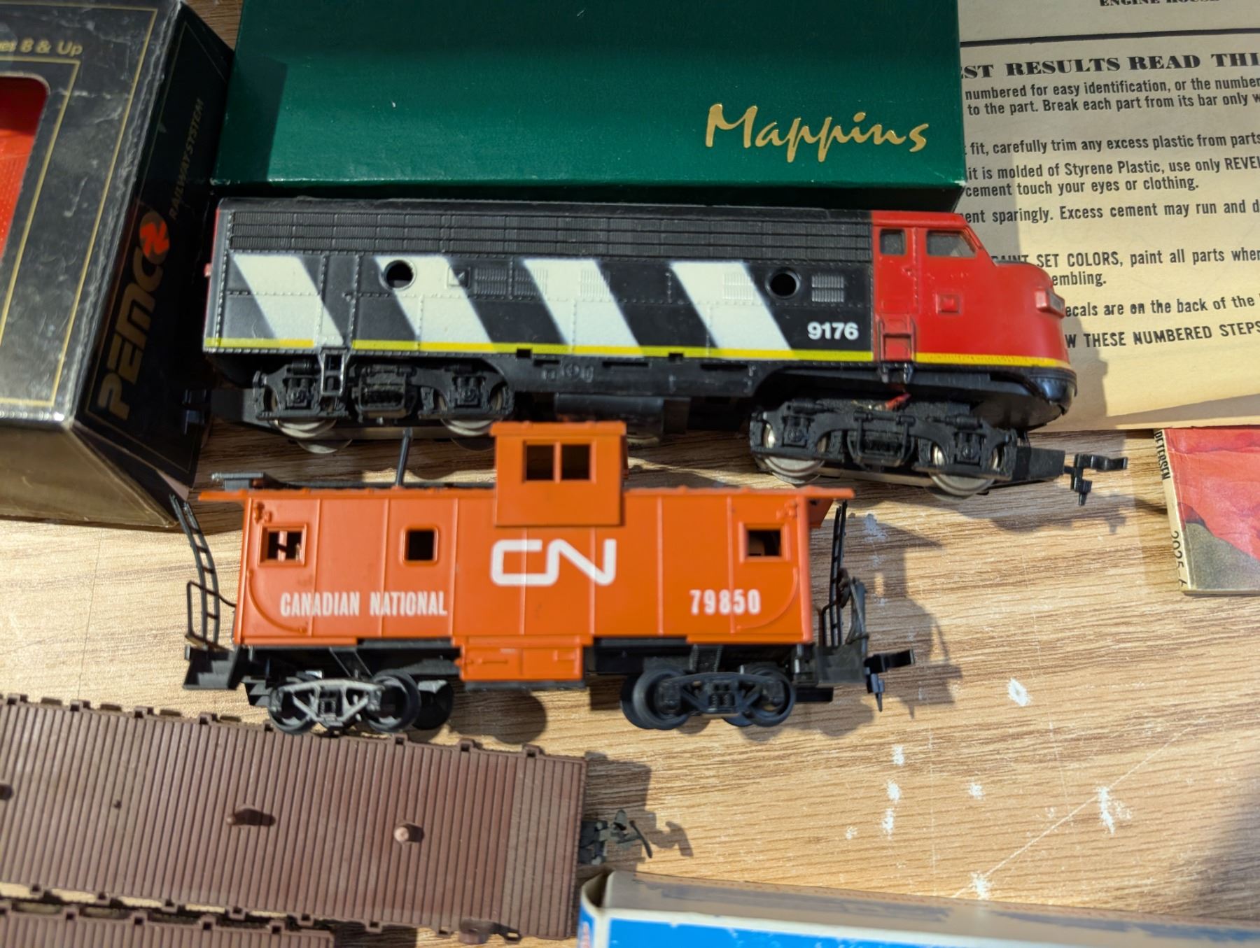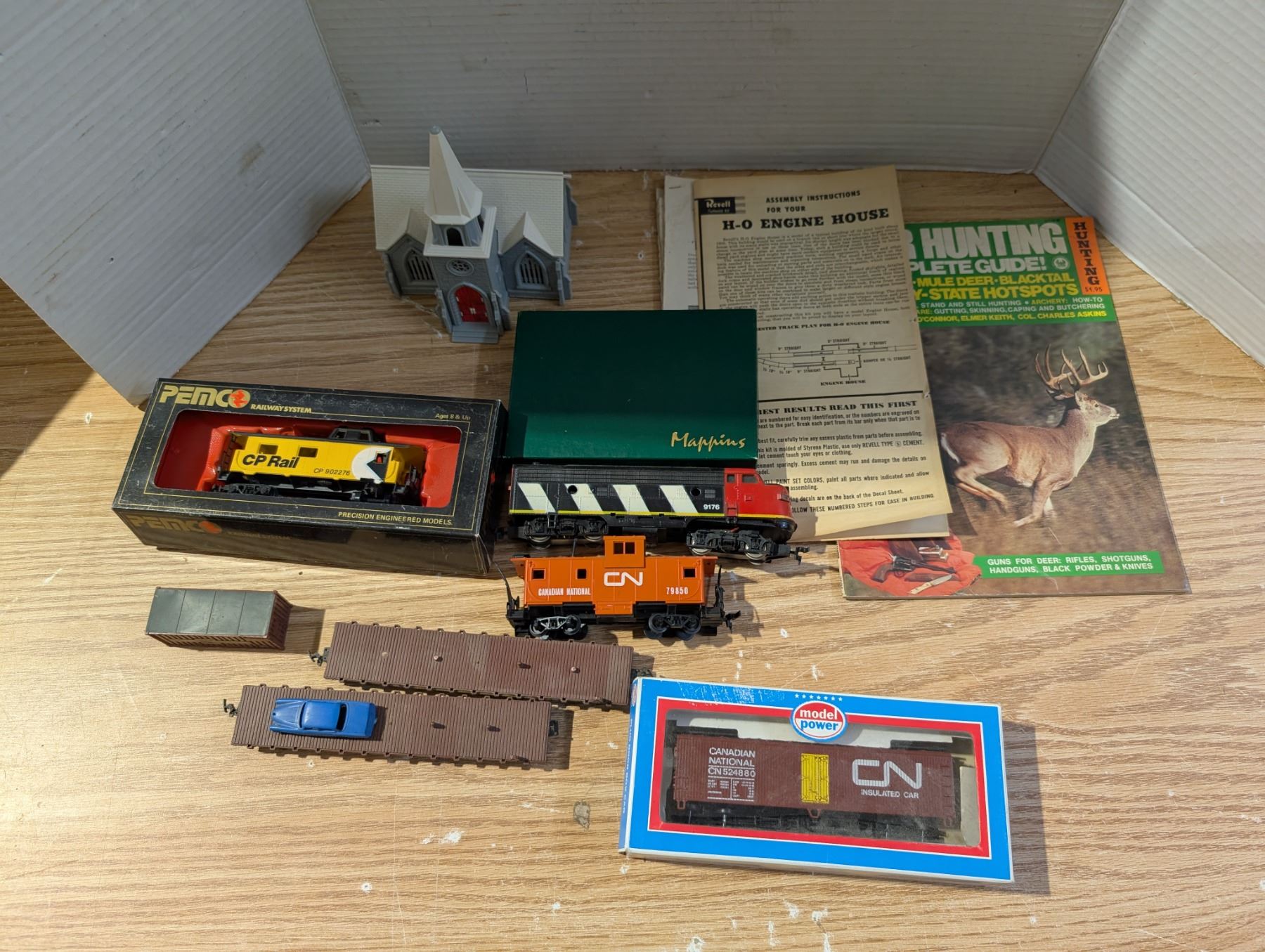 Box full of Misc. Train Items (Trains, Old Papers of Trains, Houses, and etc.)