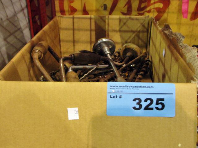 Box full of vintage drill bits and hand drills