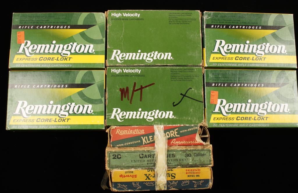 100 rounds of live Remington cartridges, 20 spent cases and three old (possibly collectible) boxes taped together with an unknown quantity of cartridges.