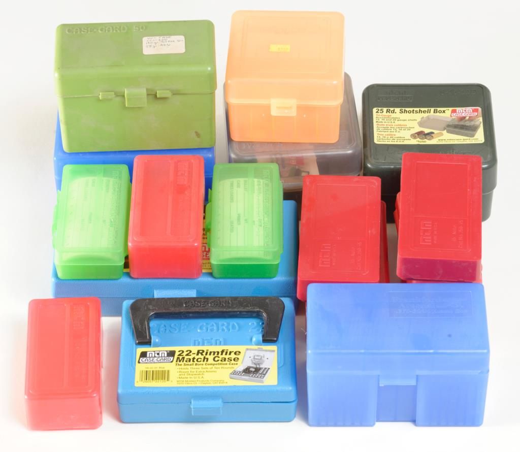 Box lot of approx. 17 different sized plastic ammo case holders; great for the home re-loader. Est.: $25-$50.