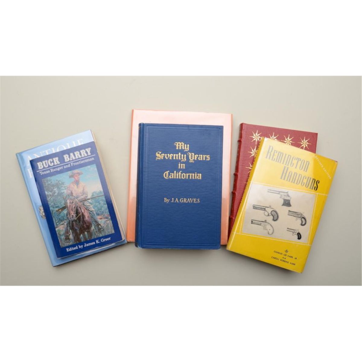 Box lot of approx. 20 gun and western-related books including books on Remington handguns, shotguns, Martial Single Shot pistols, etc.; also included are several books on ancestry research. Est.: $100-$200.