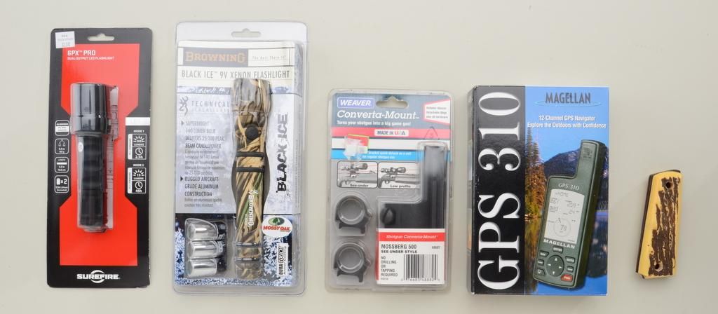Box lot of high quality accessories including a Magellan GPS 310 12-Channel Navigator in the factory box; a Surefire Model 6PX Pro dual-output LED flashlight new in the box; a Browning Black Ice 9V Xenon flashlight likenew in the box with 25,000 peak beam candlepower; a pair of Jay Scott custom wood and faux stag grips for a Model 1911 pistol and a Weaver Converta-Mount scope mount with scope rings for a Mossberg 500 shotgun, likenew in the box. Est.: $125-$250.