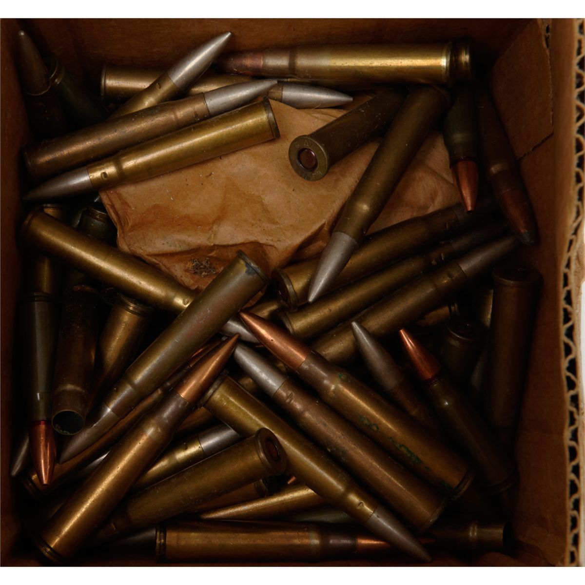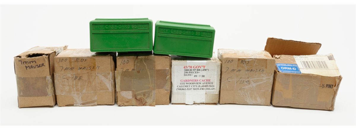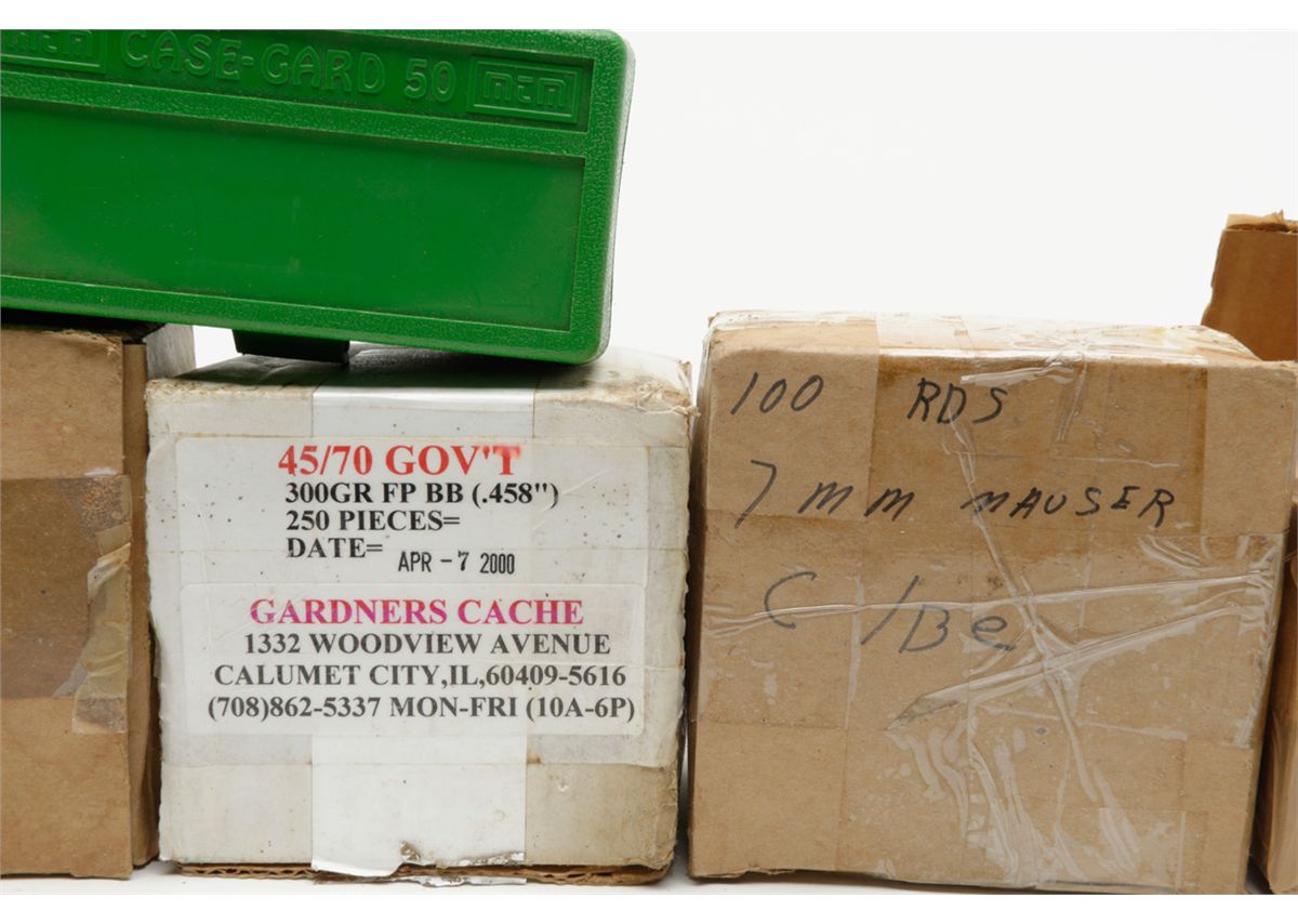 Box lot of misc. ammo including 7mm, etc., lead bullets, empty case guards. Est.: $50-$100.