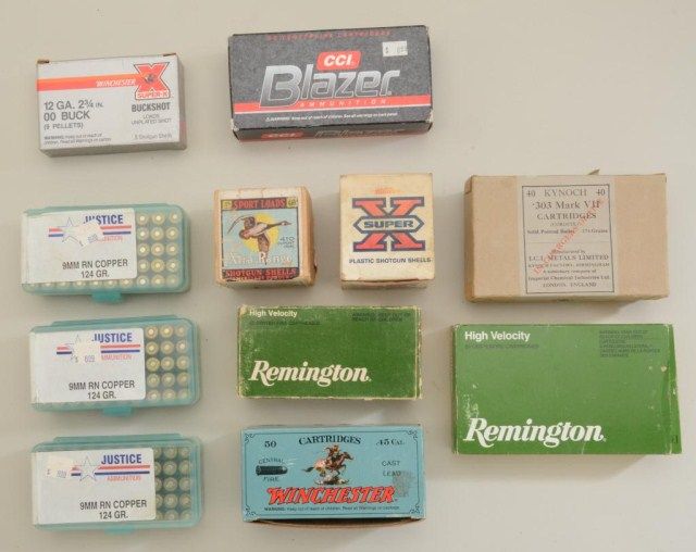 Box lot of misc. ammo including a box of Kynoch .303 Mark VII cartridges, lot of 3 boxes of 9mm ammo by Justice, a box of .45 Colt, a box of .25-20 Win.; a box of .303 British; another box of 9mm; a box of 12gauge and two boxes of .410 gauge; also a bandolier of empty clips and a bandolier of military ammo in what appears to be some type of .30 caliber. Est.: $75-$150.