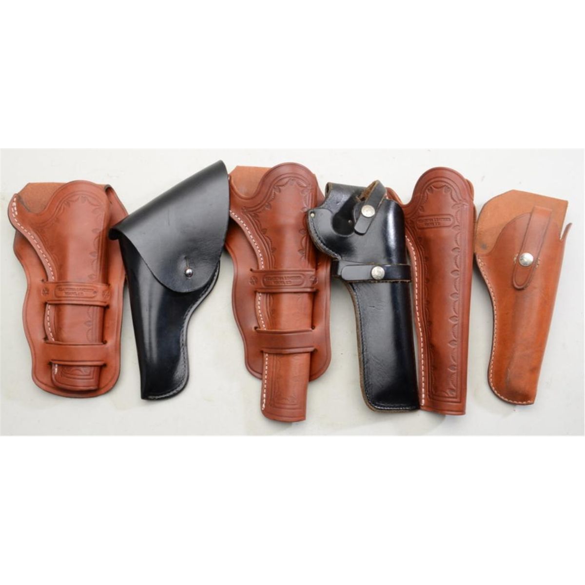 Box lot of modern leather holsters and belts  for single action revolvers, Tokarev pistols  by various makers and most in like new  condition.  Est.:  $100-$150.