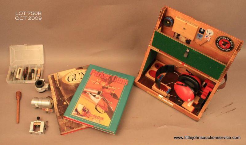 Box lot of range shooting and gun cleaning  equipment including a pistol range wood box  approx. 13” x 8” x 7”; with ear protectors, Outers  metal rifle cleaning kit with accessories, extra  misc. gun cleaning supplies and two gun referencebooks including “Parker Guns” by Muderlak and “  The Teasury of the Gun” by Peterson.  Est.:   $100-$200.