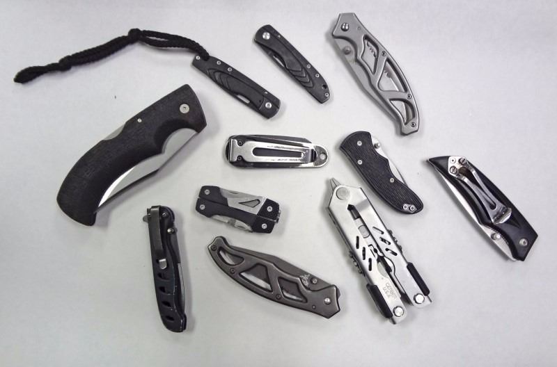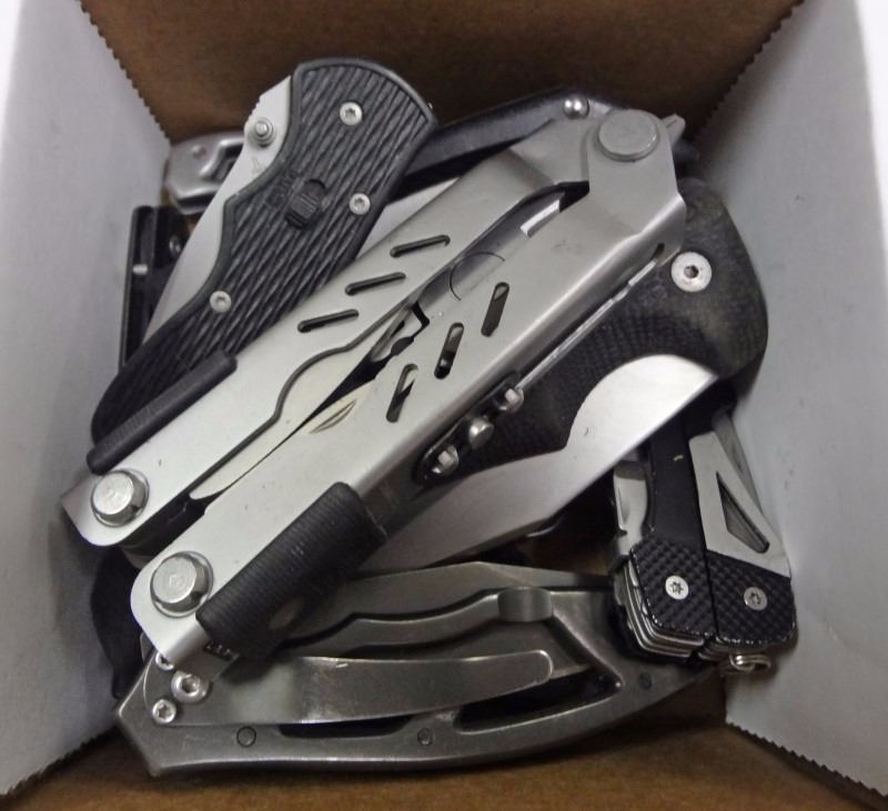 Box of 10 Gerber Multi-tools and knives. Various sizes, blade lengths, styles and functions/tools. ESTIMATE:$100-$125