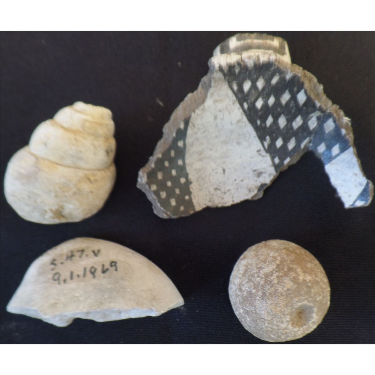 Box of twelve Anasazi artifacts made from stone, clay and pumice. The items are from four corners area, with exception of one pottery fragment from Europe. There is a nice variety of stone and pottery. Items as found. Shipping $20