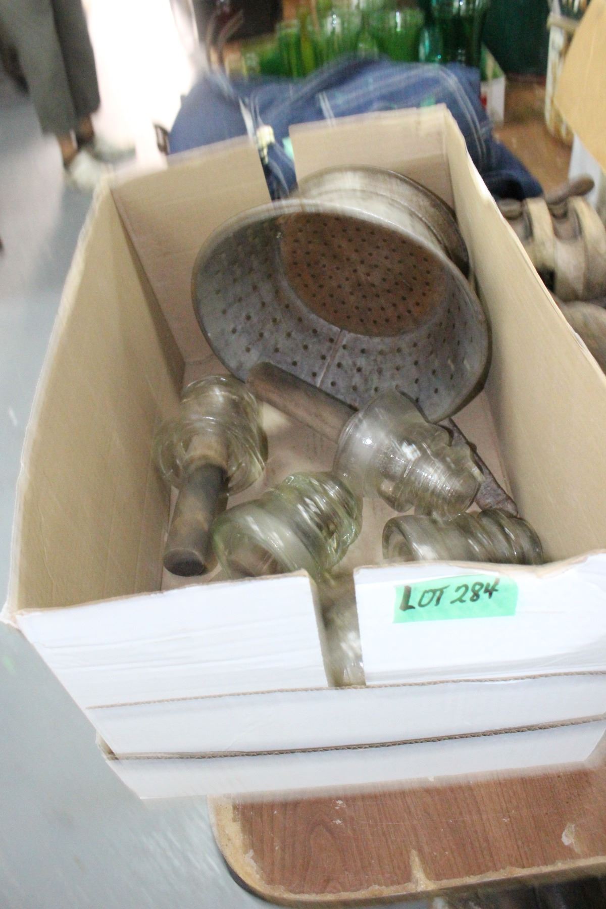 Box of 5 Insulators, 1 Strainer & 2 Old Tools