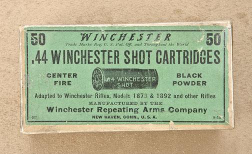 Box of 50 .44 Winchester black powder Shot Cartridges by Winchester with green label “Adapted to Winchester Rifles, Models 1873 & 1892 and other Rifles” in overall excellent condition with complete end labels and noteattached to the bottom of the box “Note: My research has found these later shot cartridges made with black powder were used extensively in the Wild West Shows. More smoke, more thrill”. Est.: $400-$800.