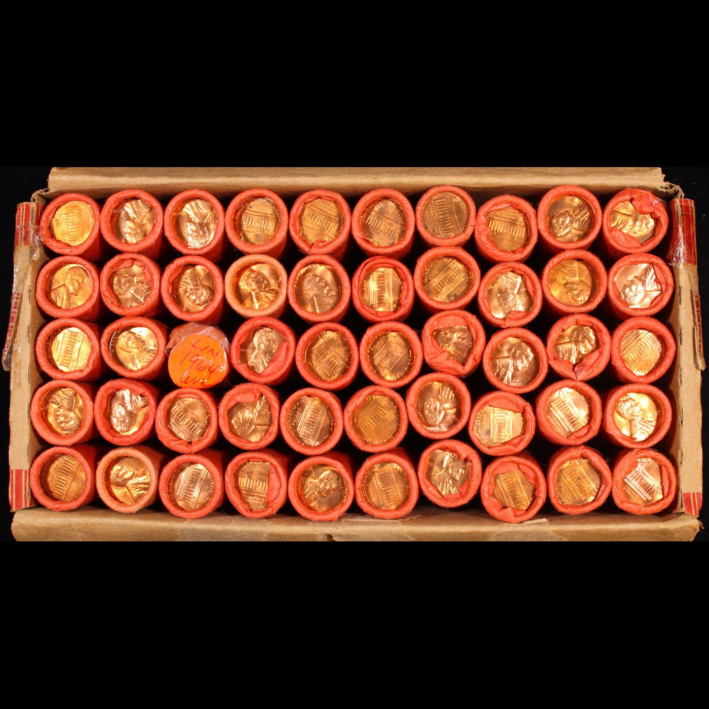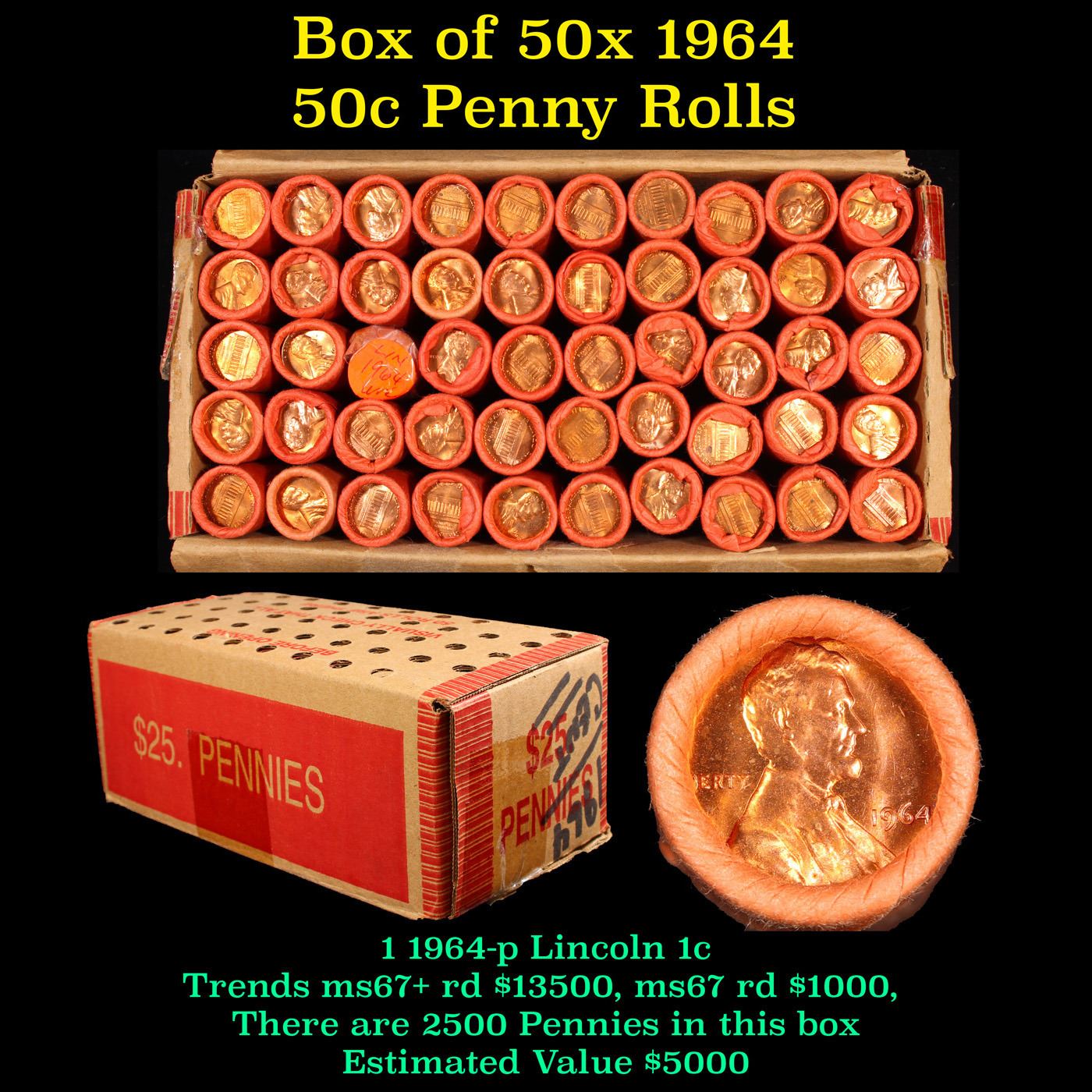 Box of 50 Rolls of 1964-p Gem Unc Lincoln Cents 1c, 50 Coins Each 2500 Coins total.