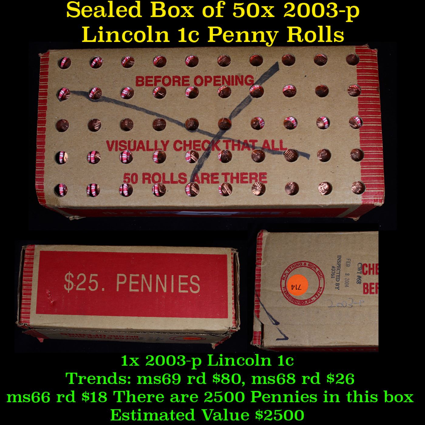 Box of 50 Rolls of 2003-p Gem Unc Lincoln Cents 1c, 50 Coins Each 2500 Coins total