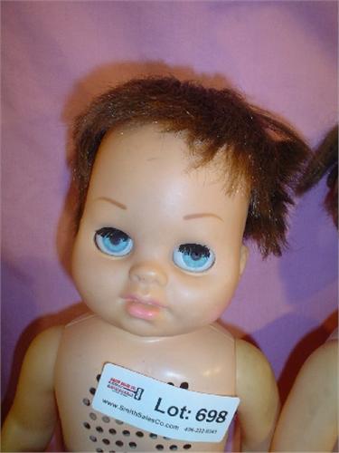 Box of 8 Dolls: Vinyl/Plastic & 2 w/Cloth Stuffed Trunks. Some need parts/repairs. All have moveable eyes (some work/some don't). Some are missing some hair. Marked: EK-15-Deluxe Reading Corp., "Tiny Chatty Baby"-Tiny Chatty Brother by Mattel 1962, 100-Deluxe Topper 1968, 30-Deluxe Topper 1968, 1974 Ideal Toy Corp. "Baby Dreams" (cloth stuffed one), "Baby Dreams" 1975 by Ideal (cloth stuffed one) & is Velvet Skinned