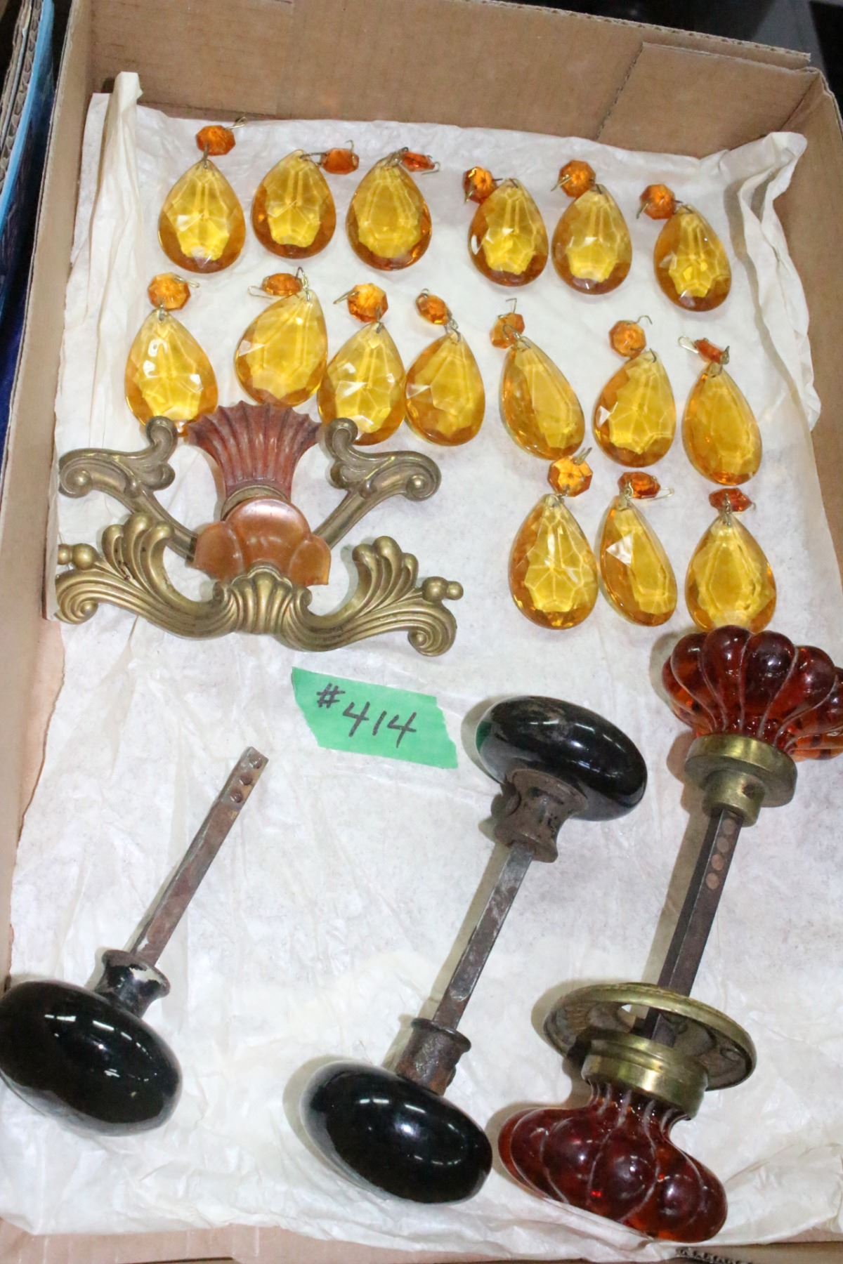 Box of Amber Chandelier Crystals; 2 Drawer Pulls with Bakelite Accessories; Amber Glass Door Knobs & 3 Black, Porcelain Door Knobs