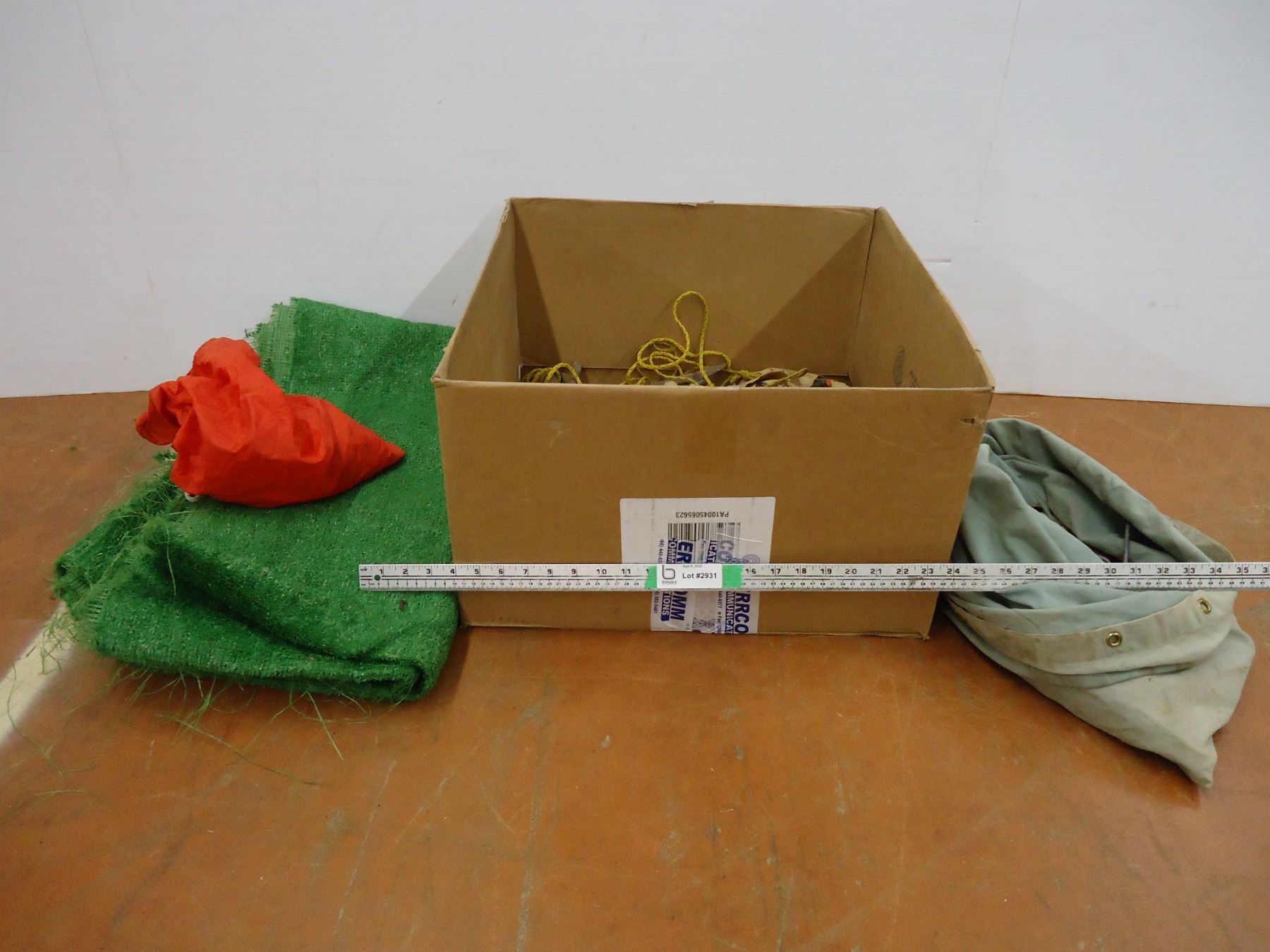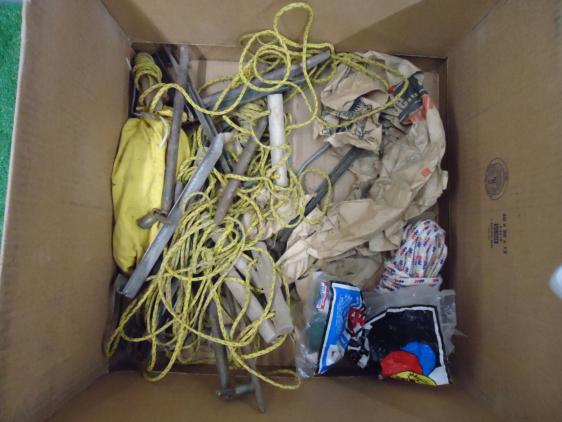*Box of Assorted Camping and Tenting items, Rope,Stakes,etc..