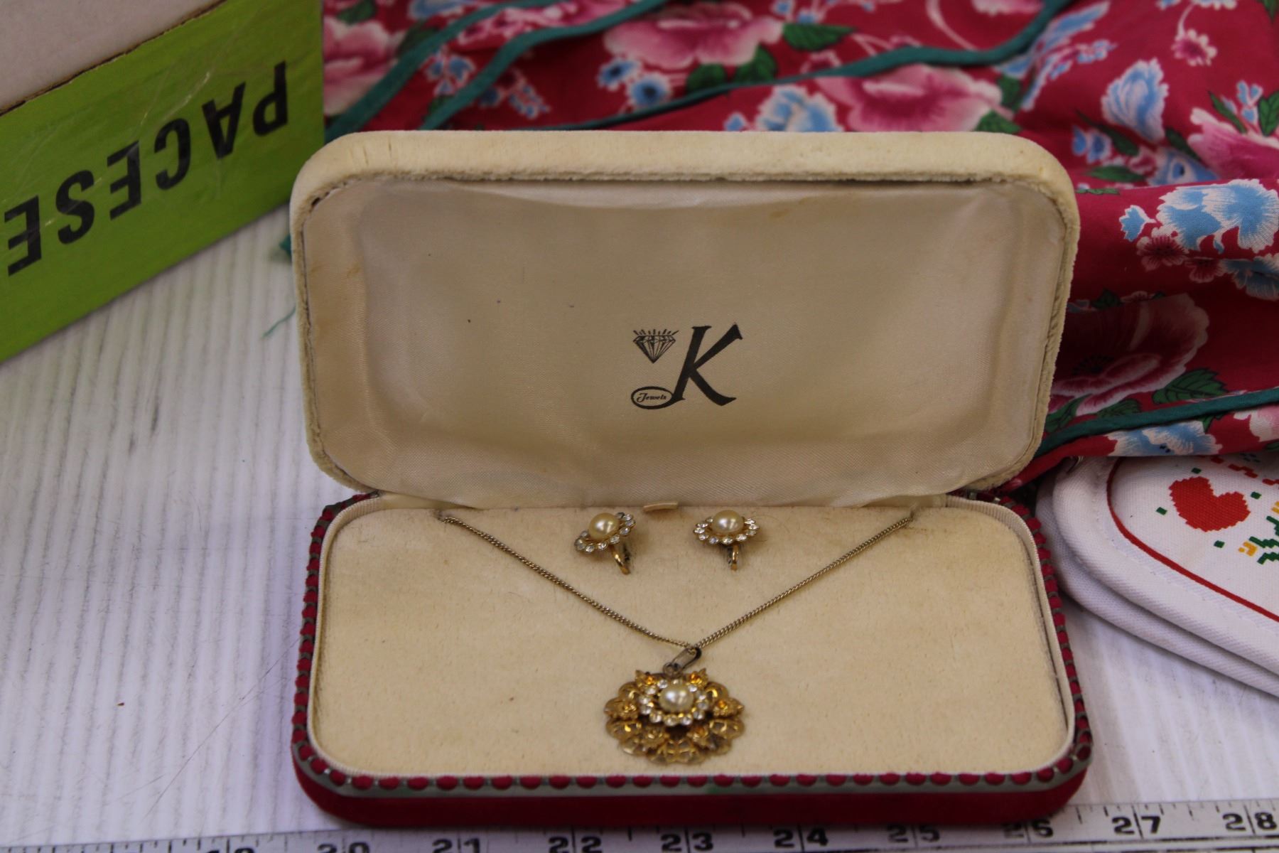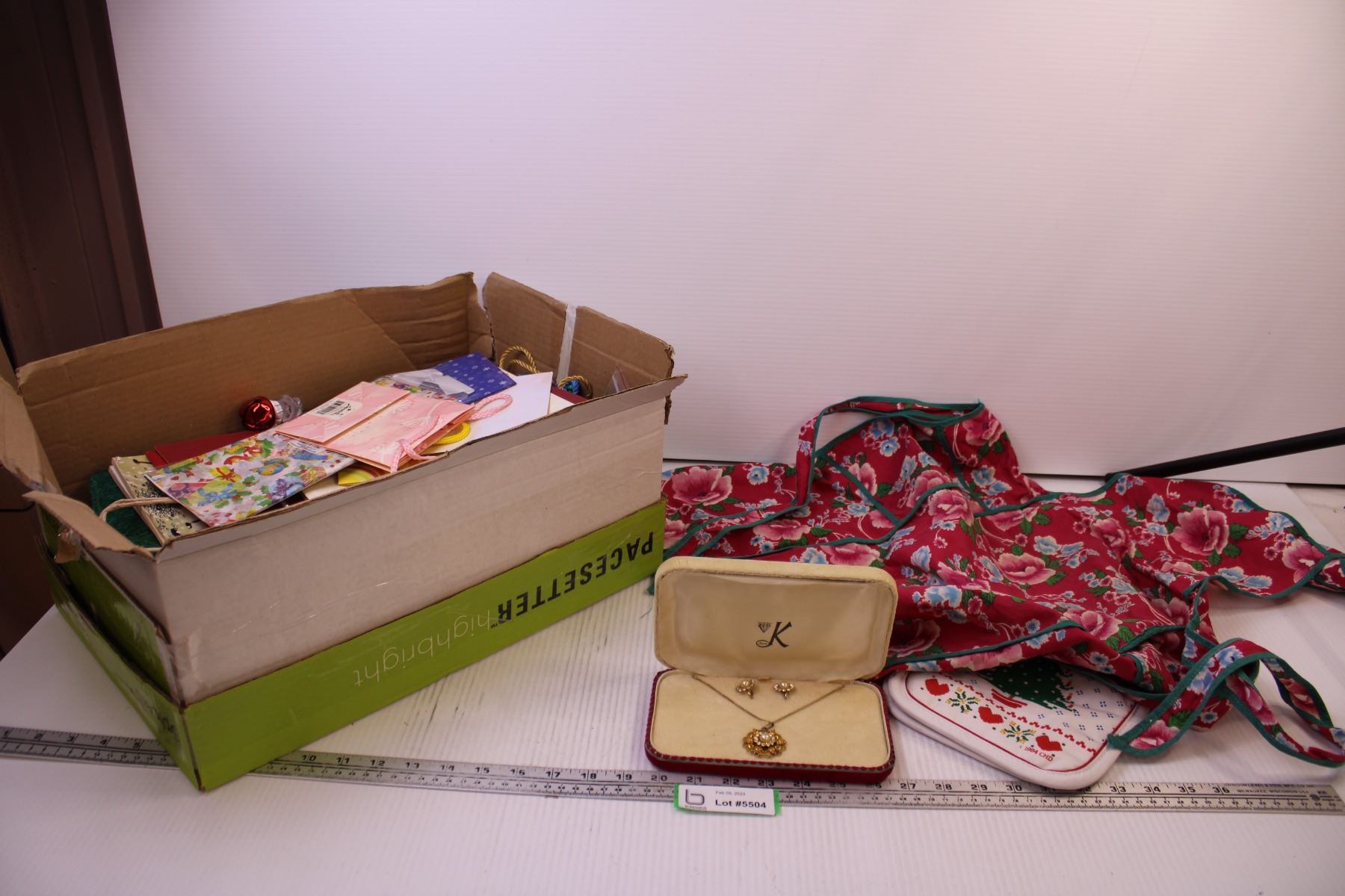 Box of Assorted Gift Bags + Necklace and Earring Set and Apron
