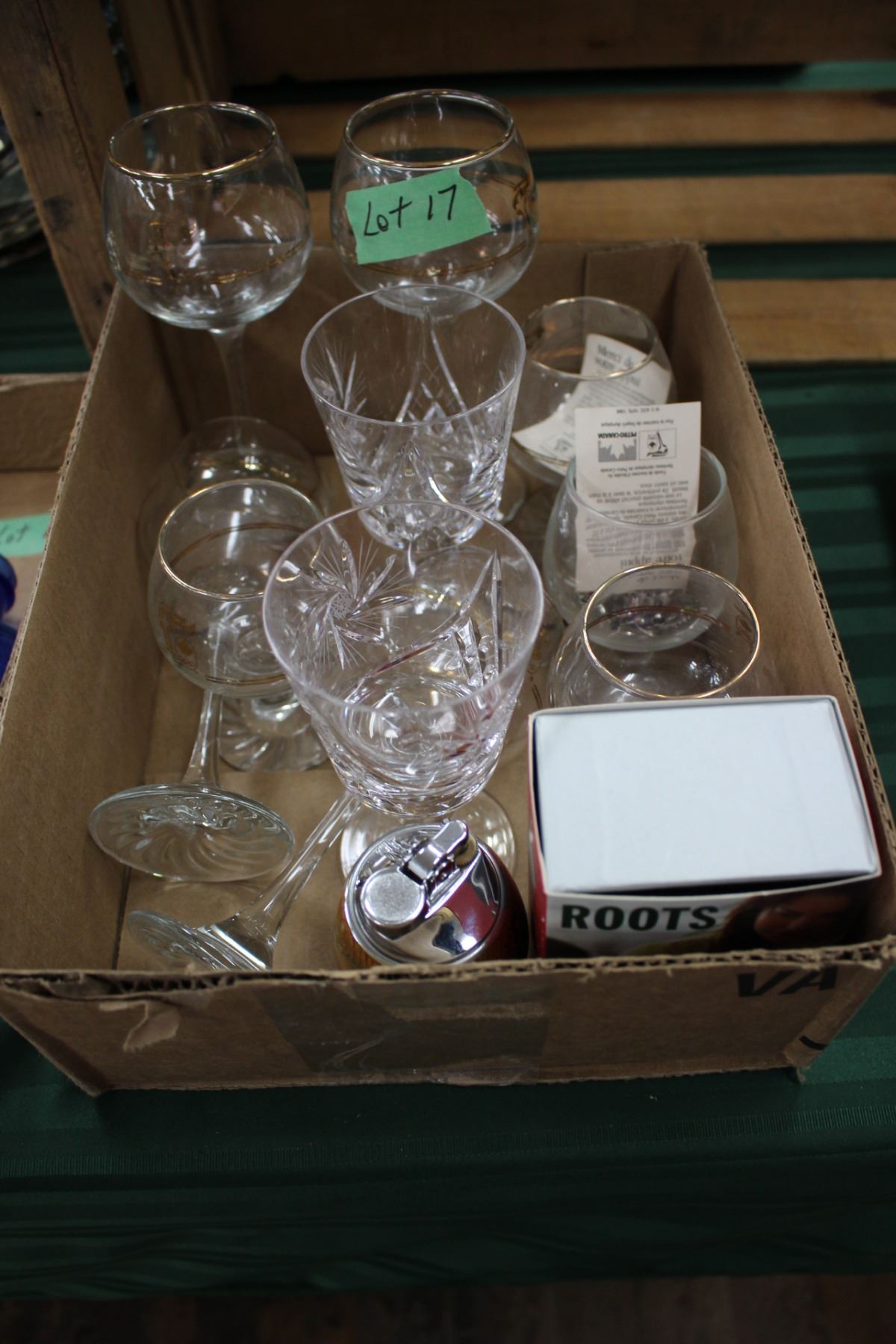 Box of Assorted Glasses; Lighter; Cards & Jewelry
