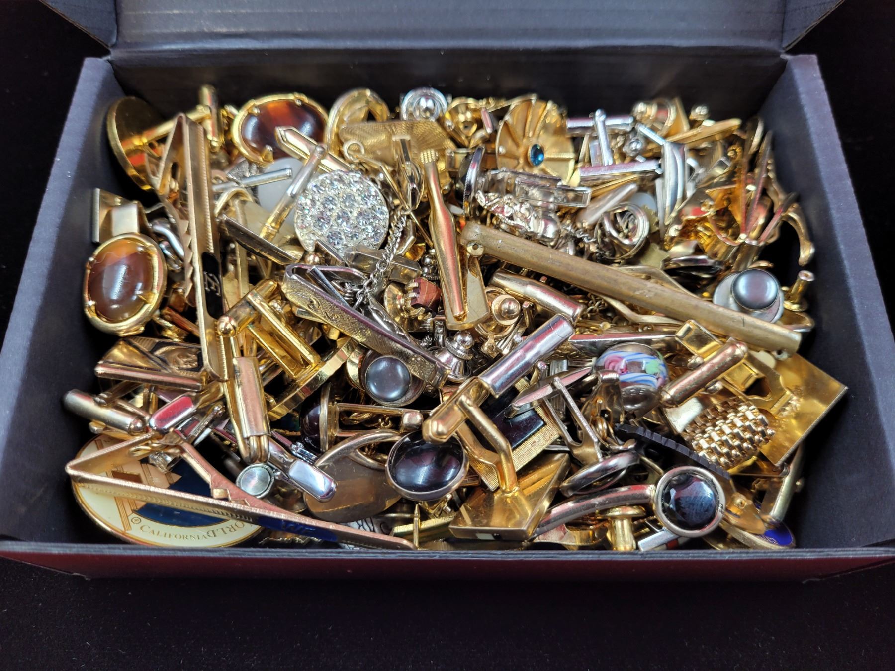 Box of Assorted VTG Cuff Links, Tie Bars, & Pins