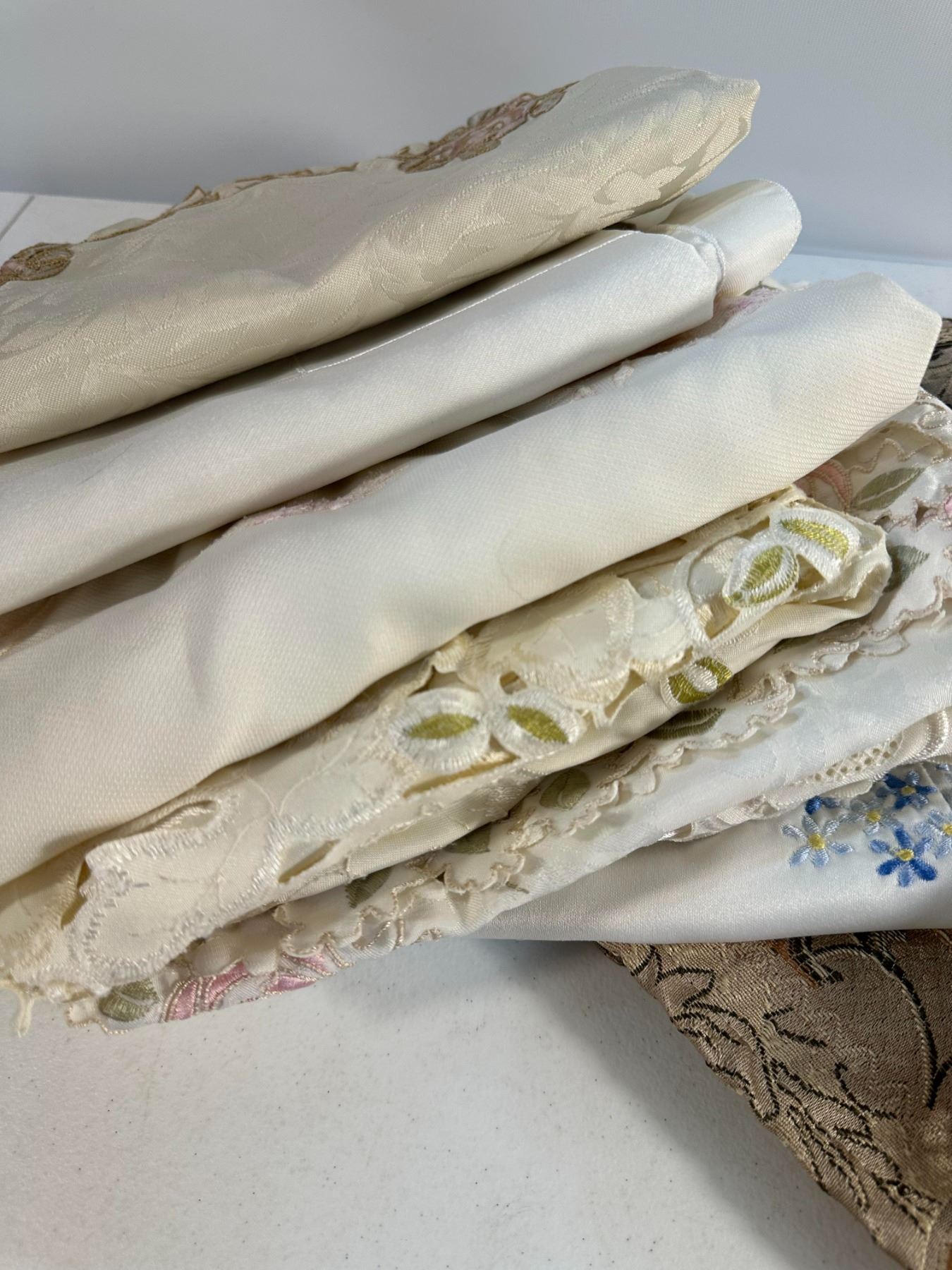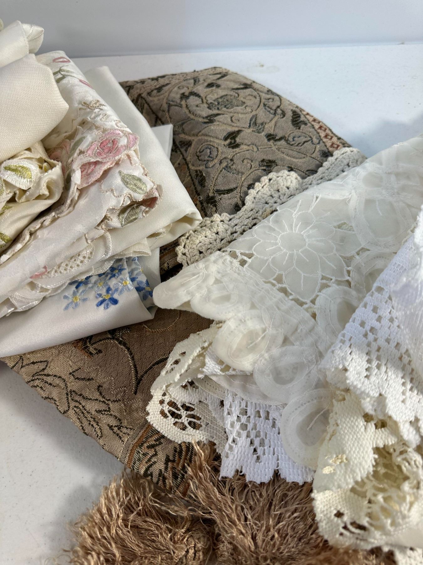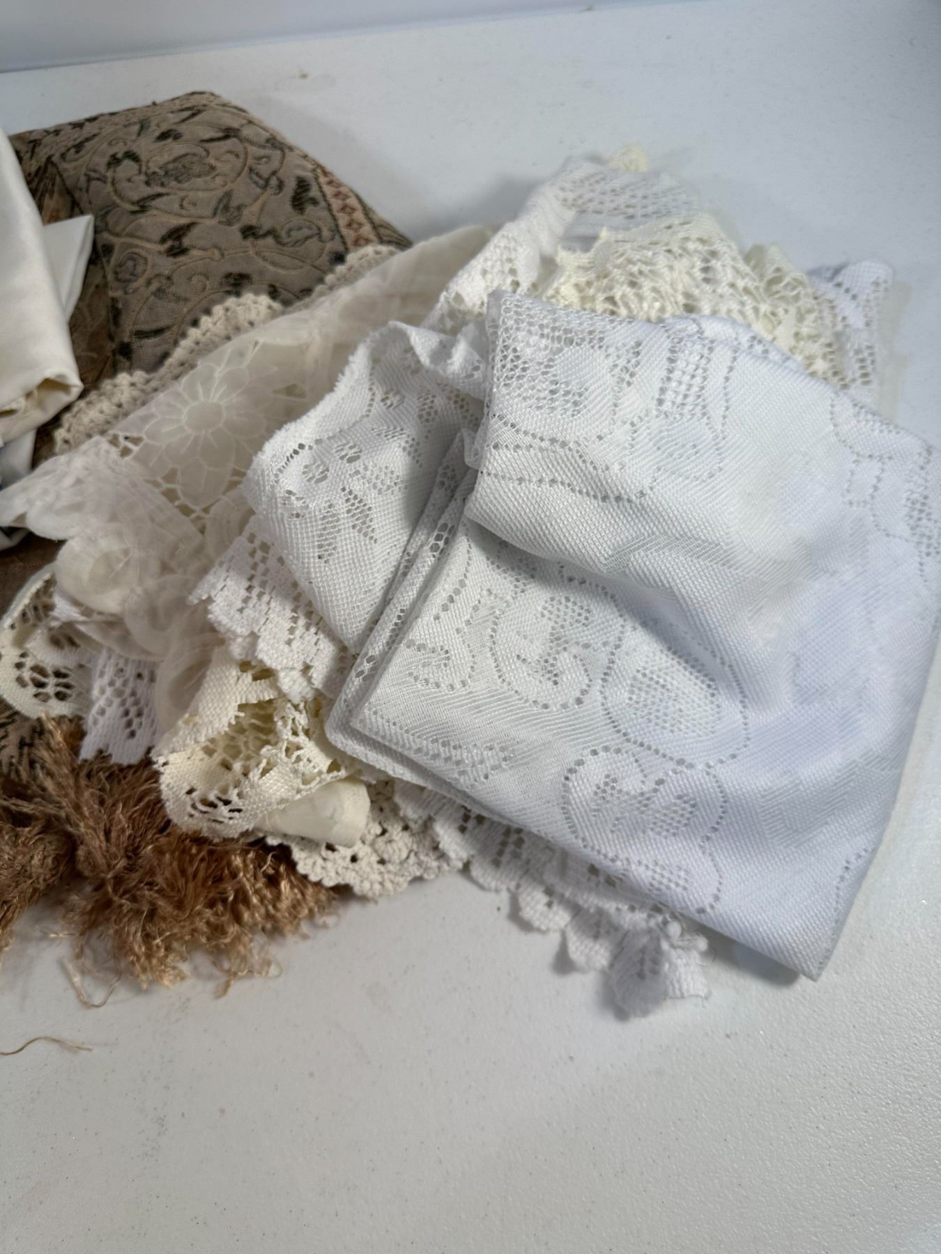 Mixed selection of vintage lace, embroidered fabric, and decorative textile remnants  ideal for sewing, restoration, or craft projects. Likely mid to late 20th century. Includes various lace trims, tassels, and satin-like materials. Some age wear and fraying consistent with use and age.