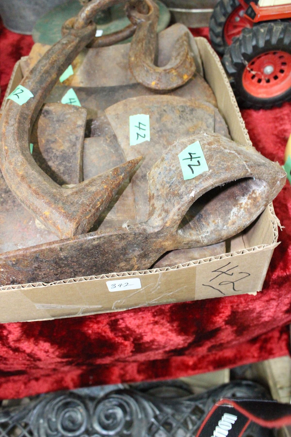 Box of Axe Heads; Grub Hoe Head & Hook