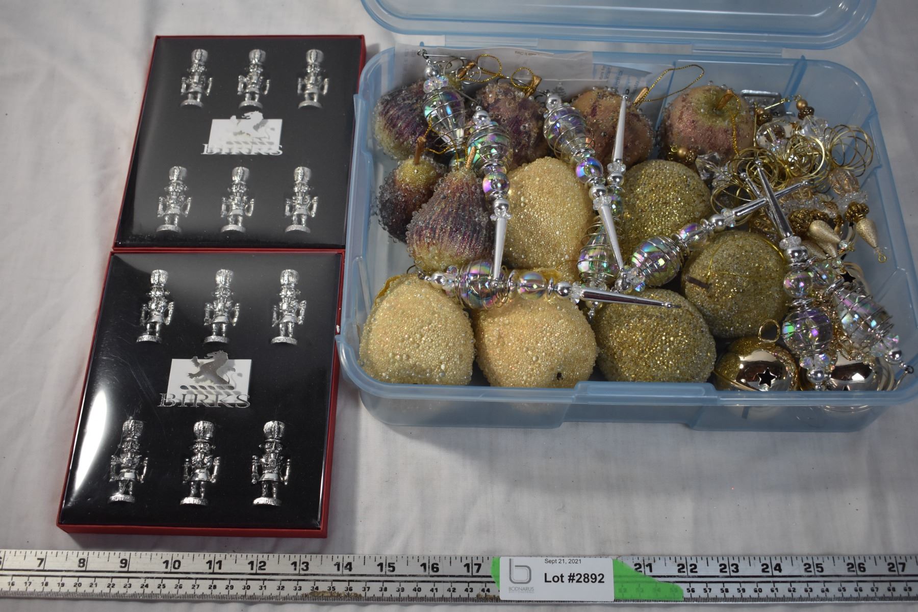 Box of Chirstmas Ornaments and Birks Nutcracker Decorations