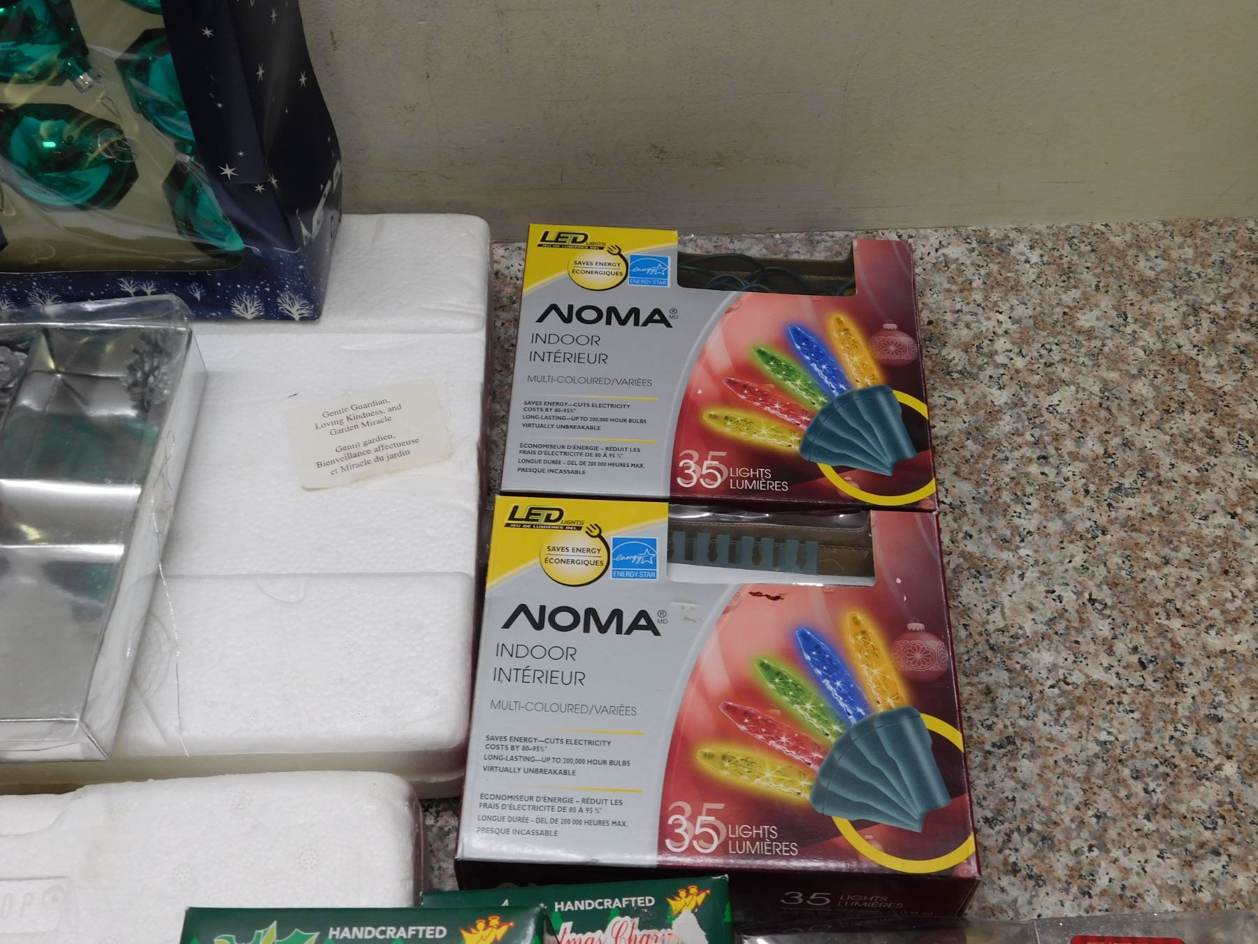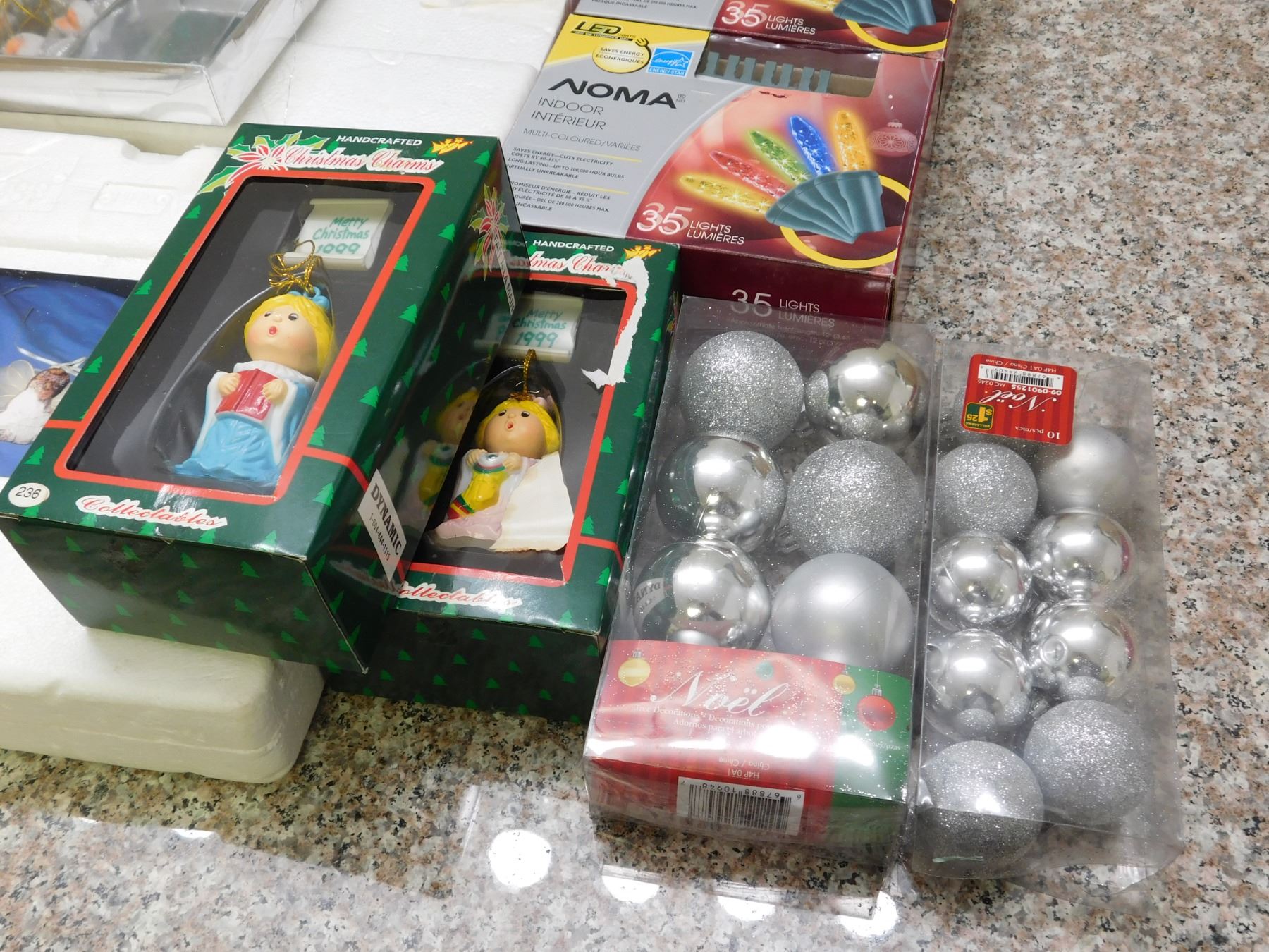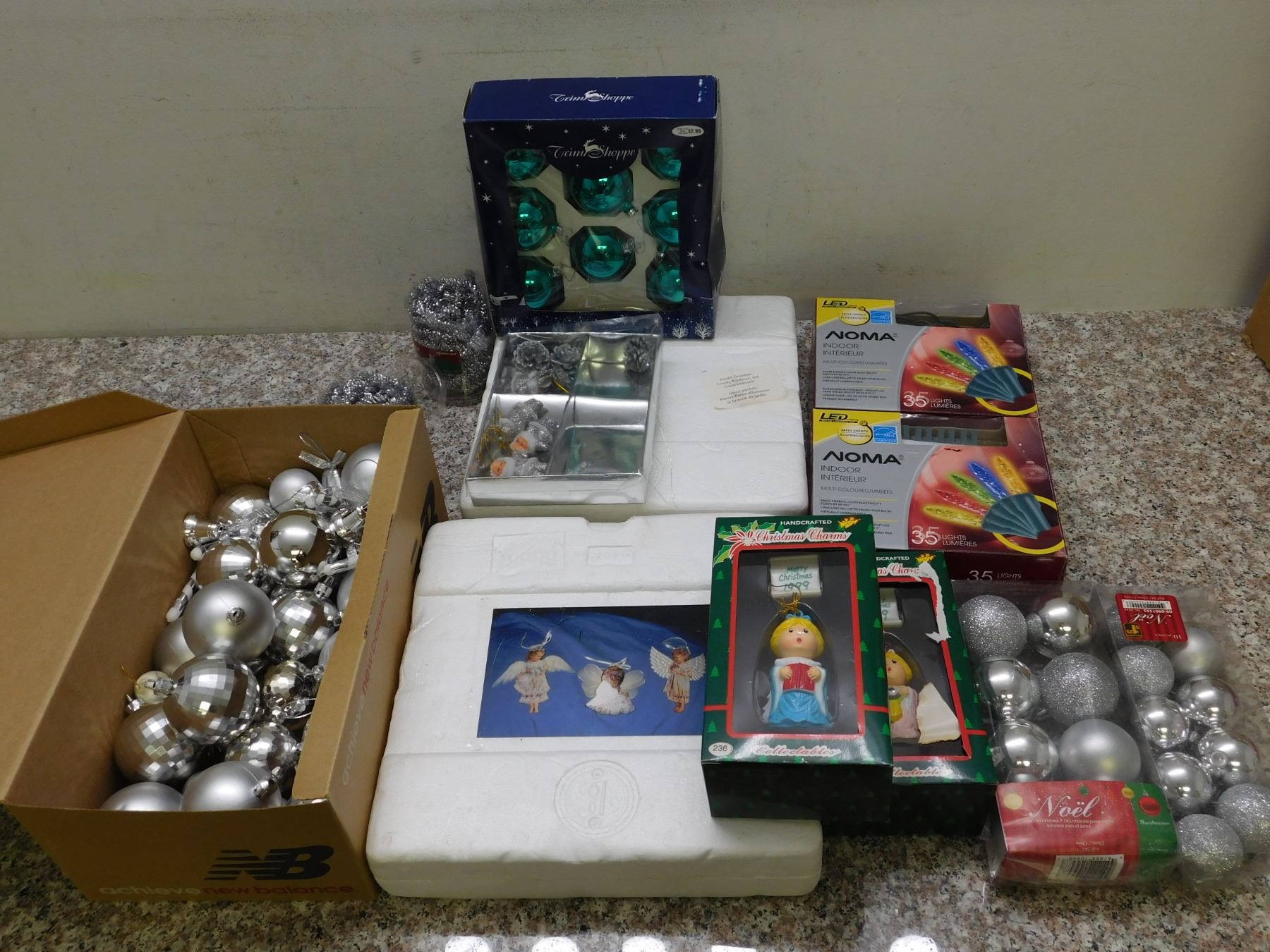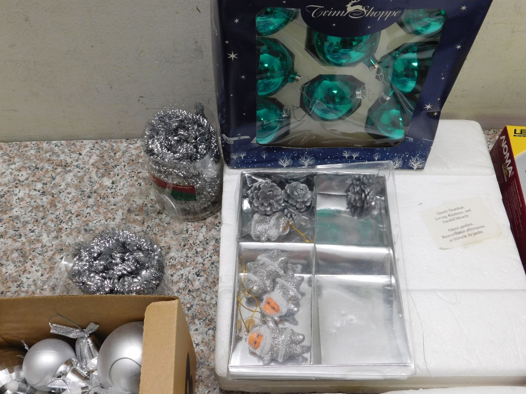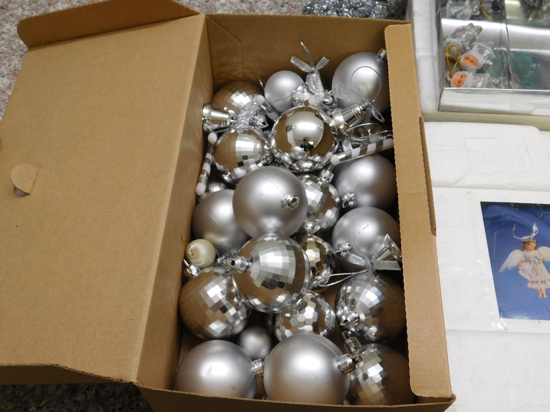 Box of Christmas Decorations Ornaments Lights Mostly Silver Theme