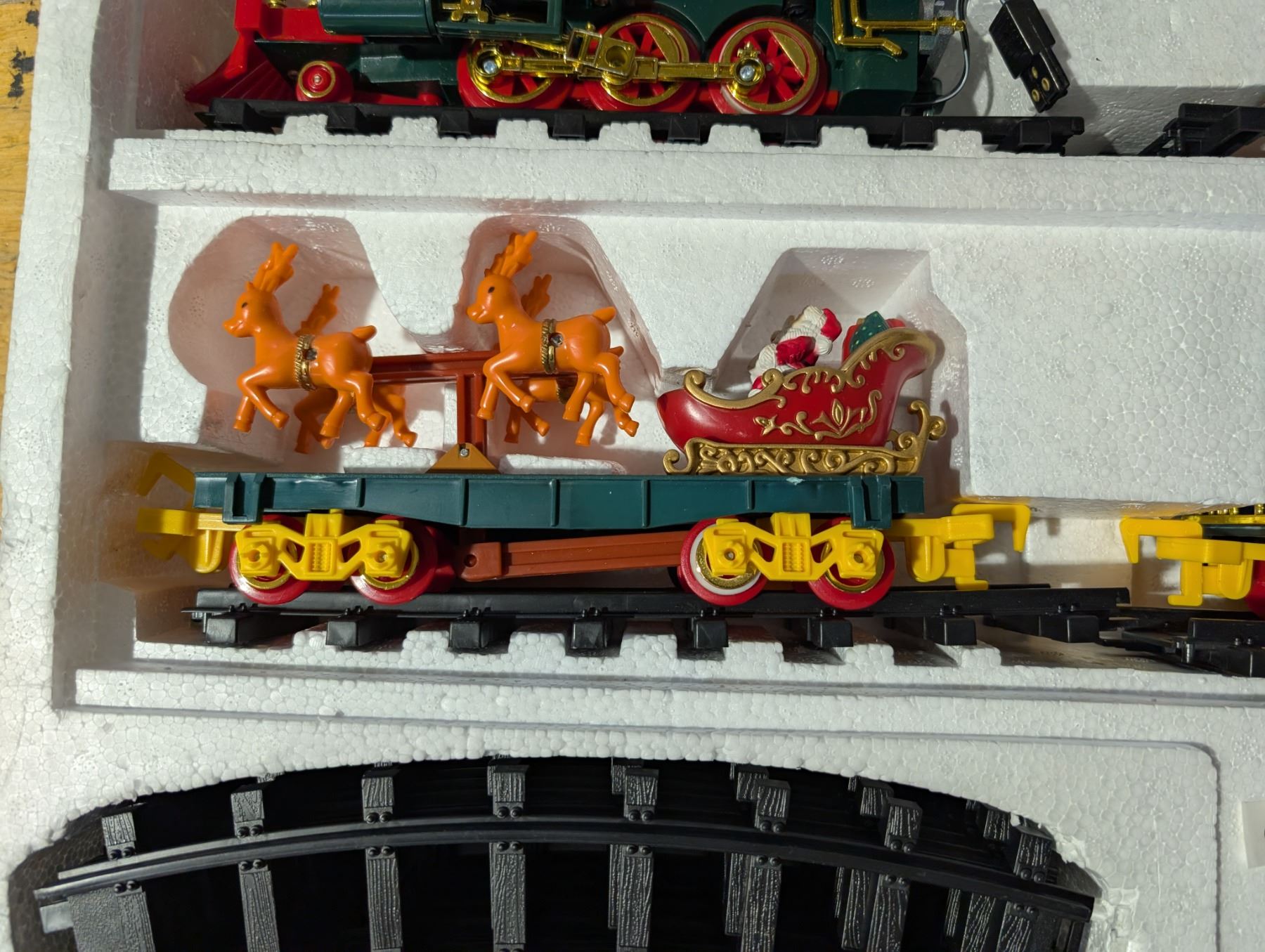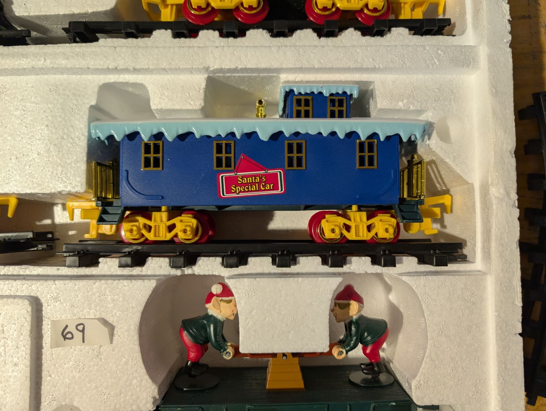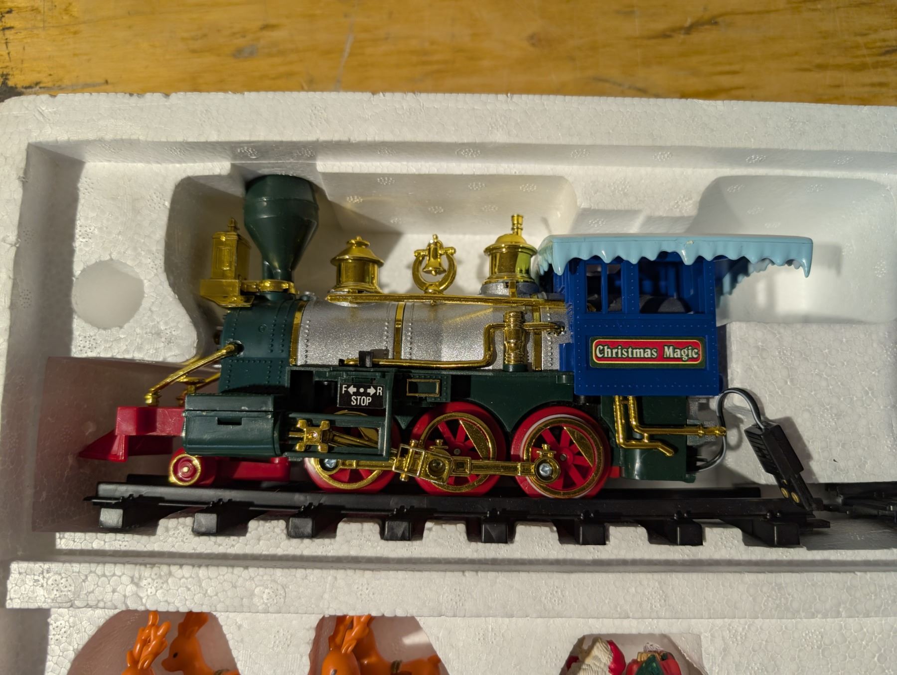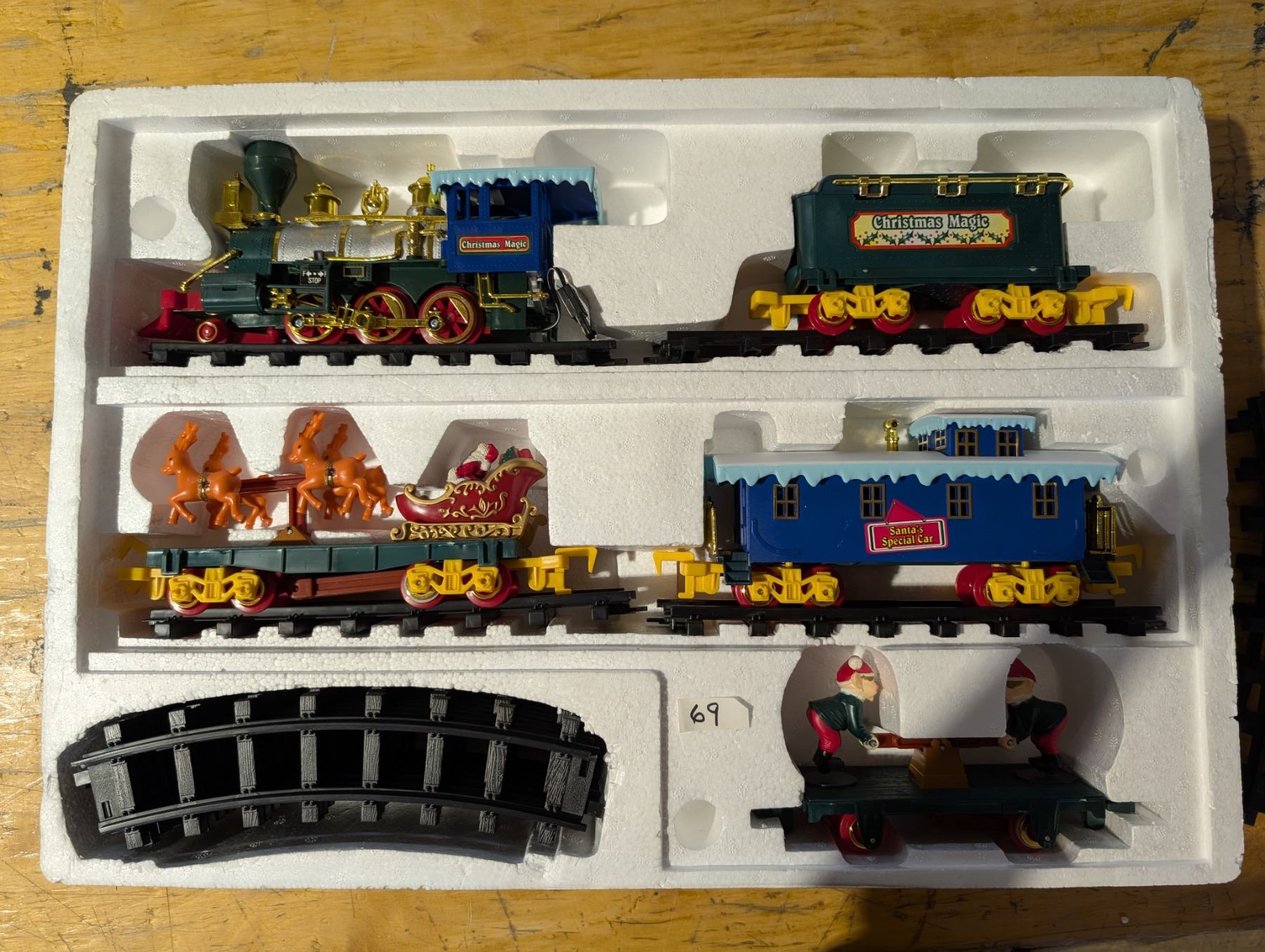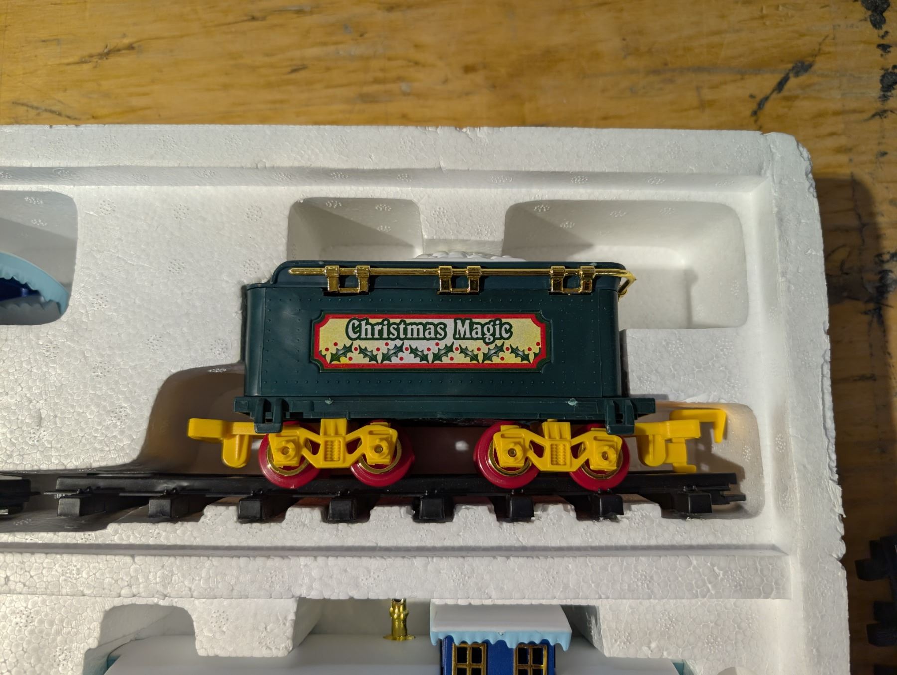 Box of 'Christmas Magic" Trains, Train Carts, Rails. and Etc.
