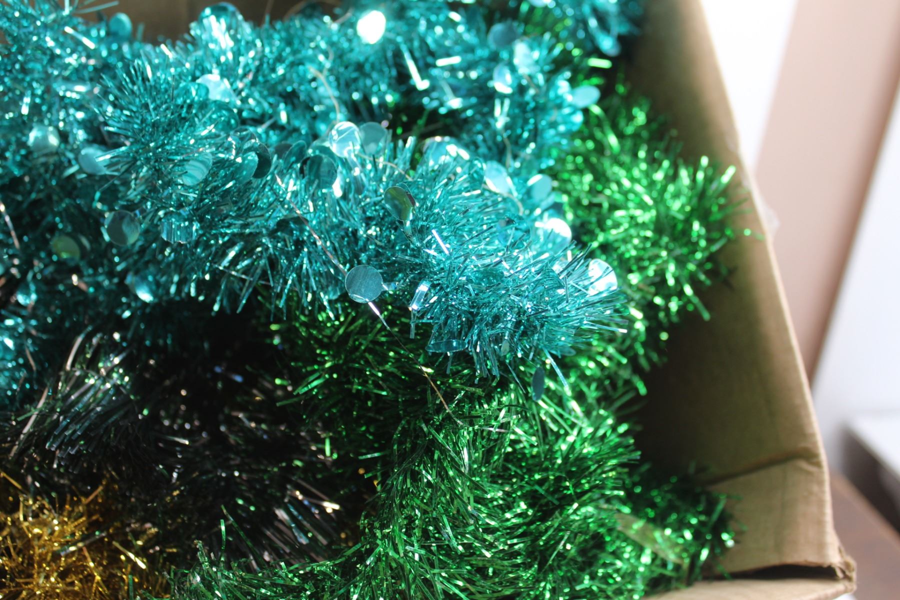 Box of Coloured Tinsel, Christmas Decorations