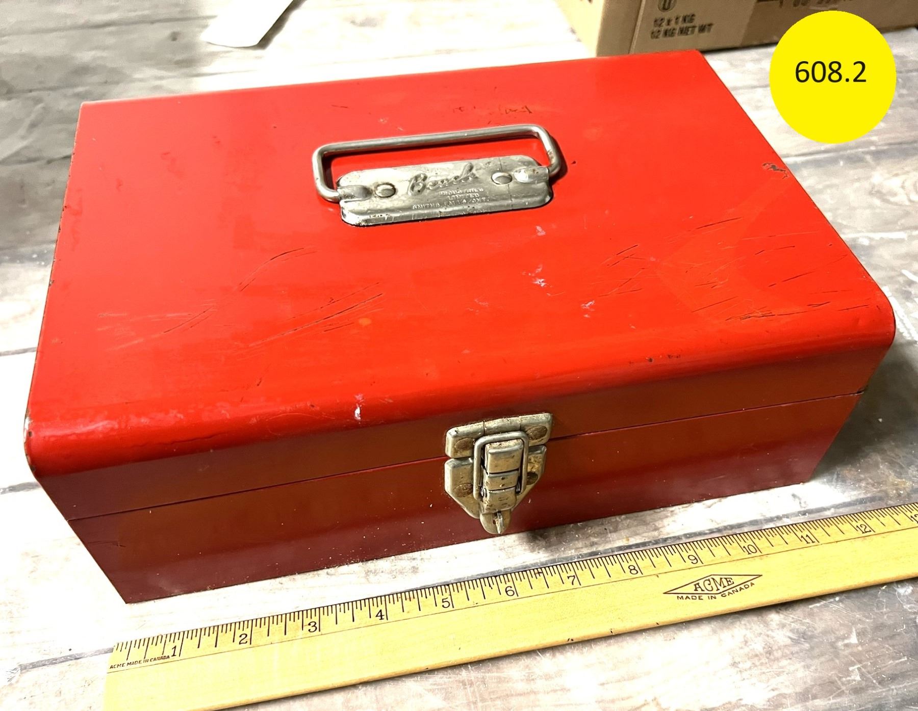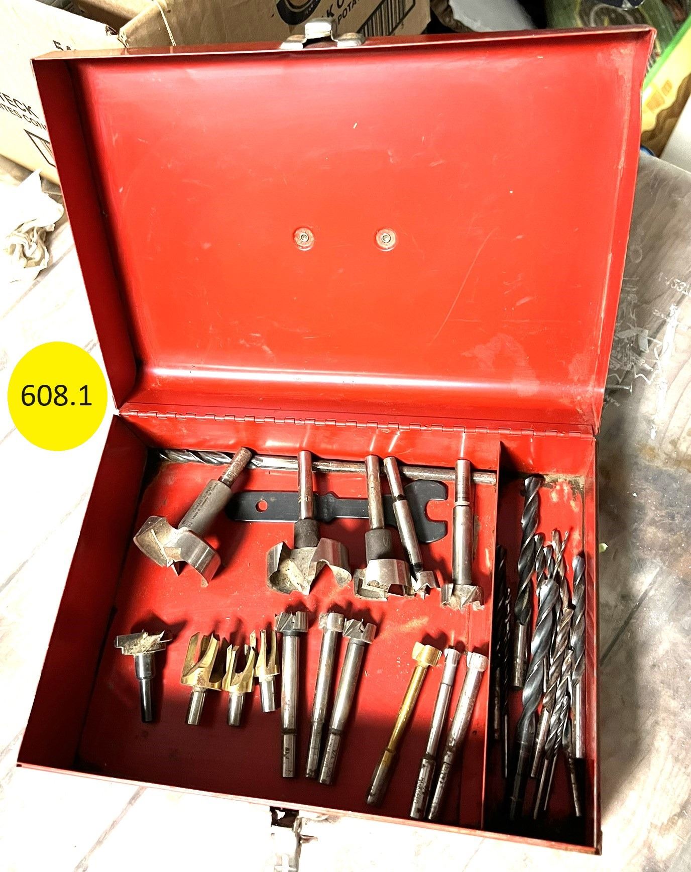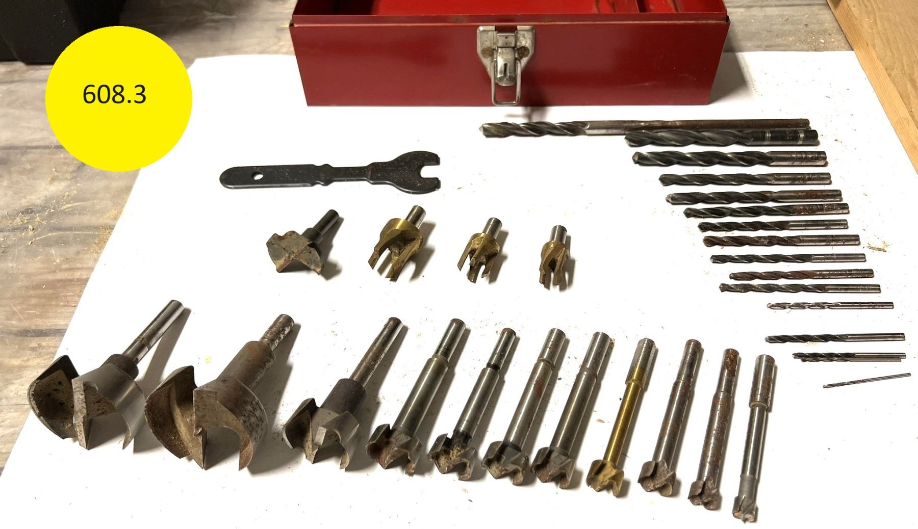 Set of 31 drill bits in a red metal "Beach" tool box. Contains 17 twist drill bits, 12 Forstner bits and a set of 3 plug hole cutter bits.