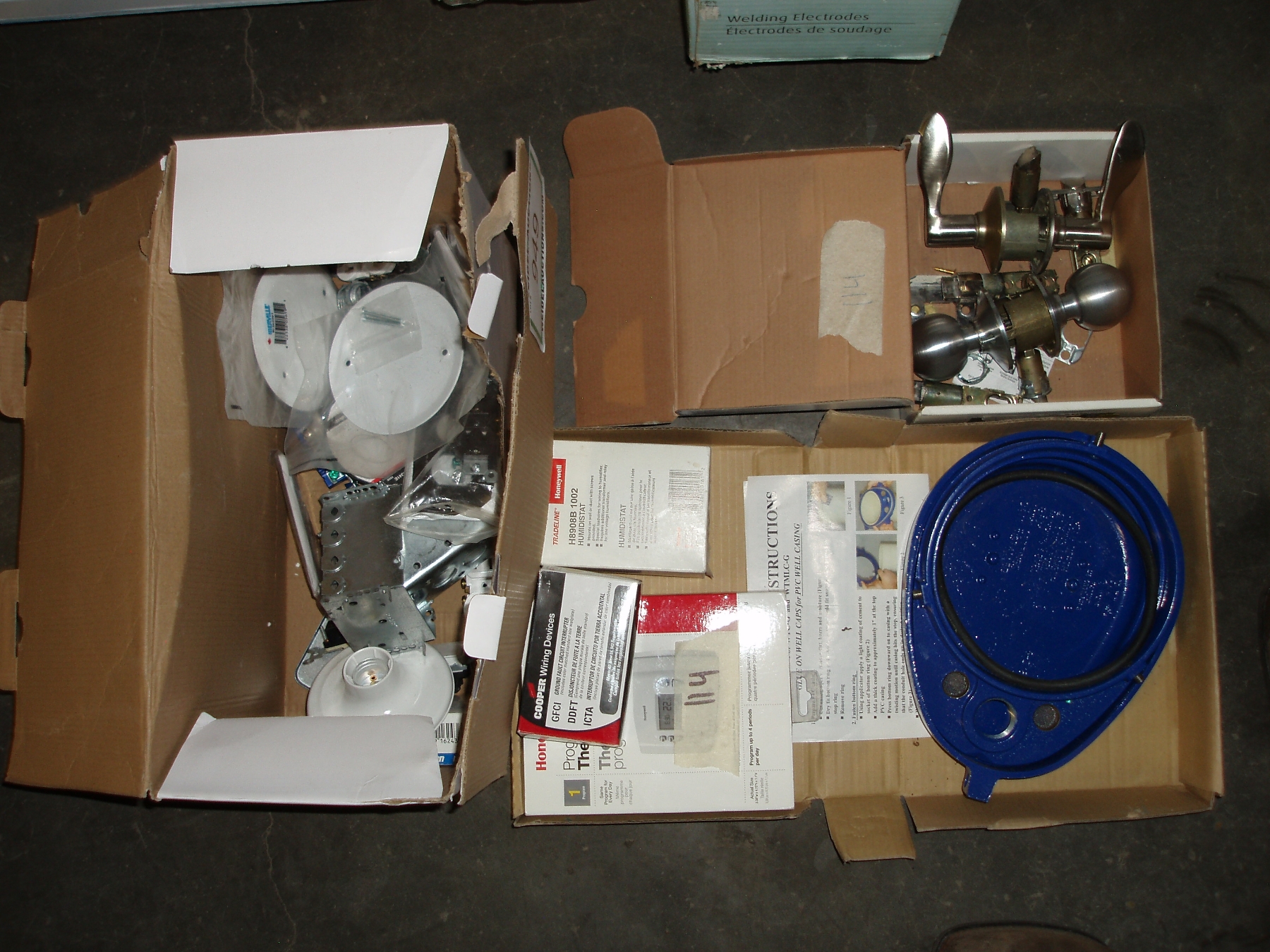 Box of Electrical Parts, PVC Well Casing - 6", Door Knobs & Thermostat