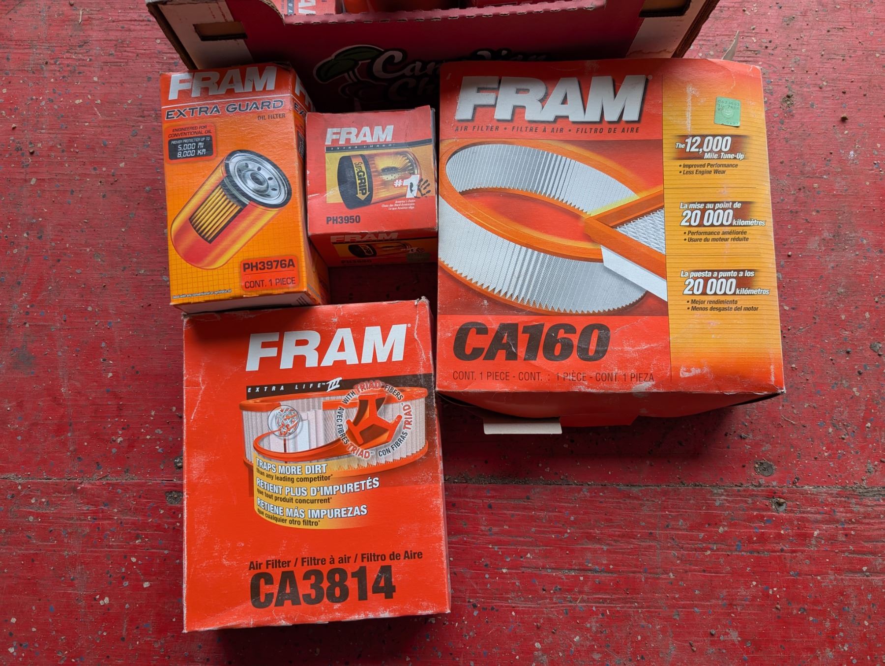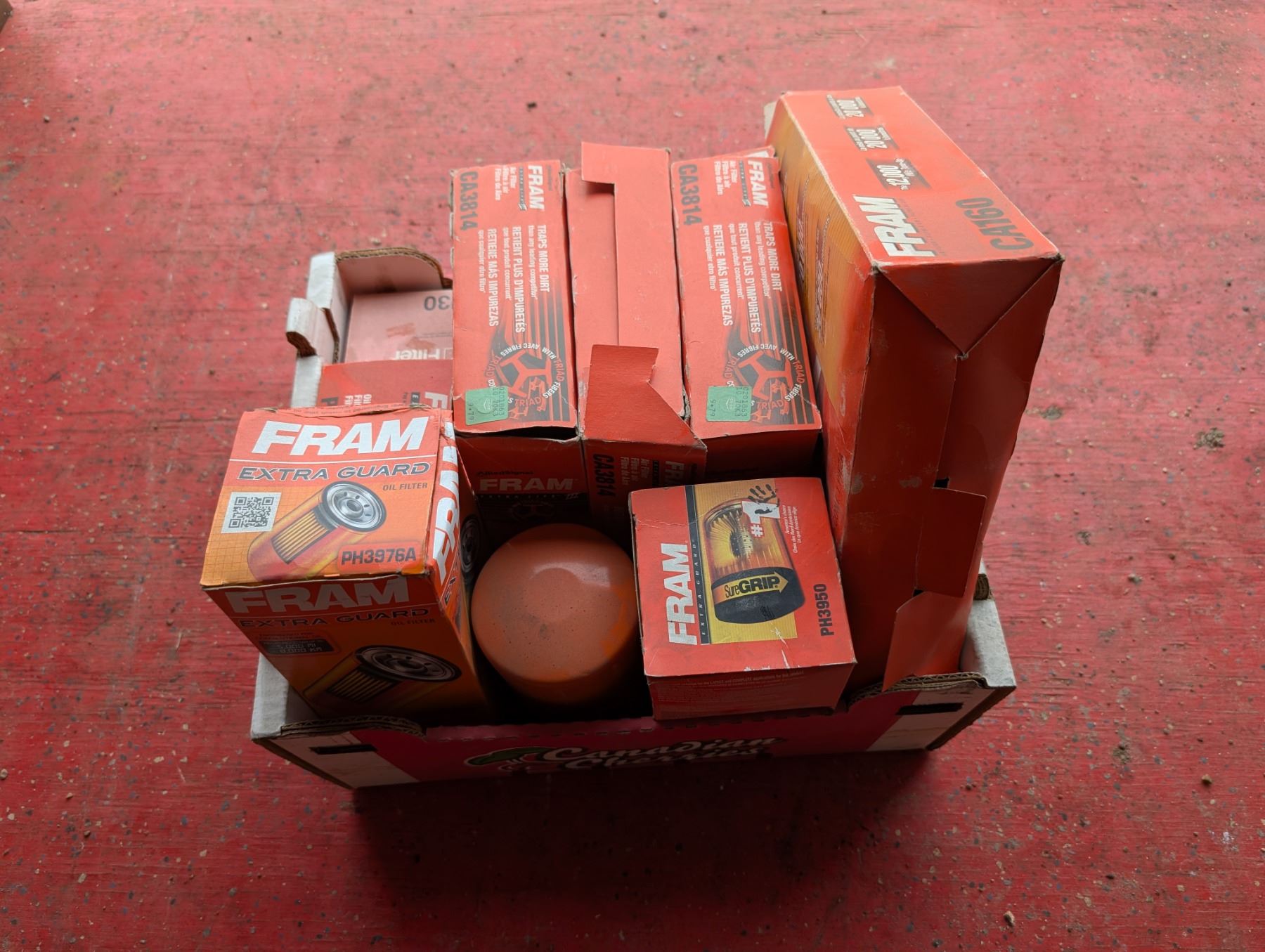 Box of FRAM Brand Oil Filters, Air Filters, and etc.