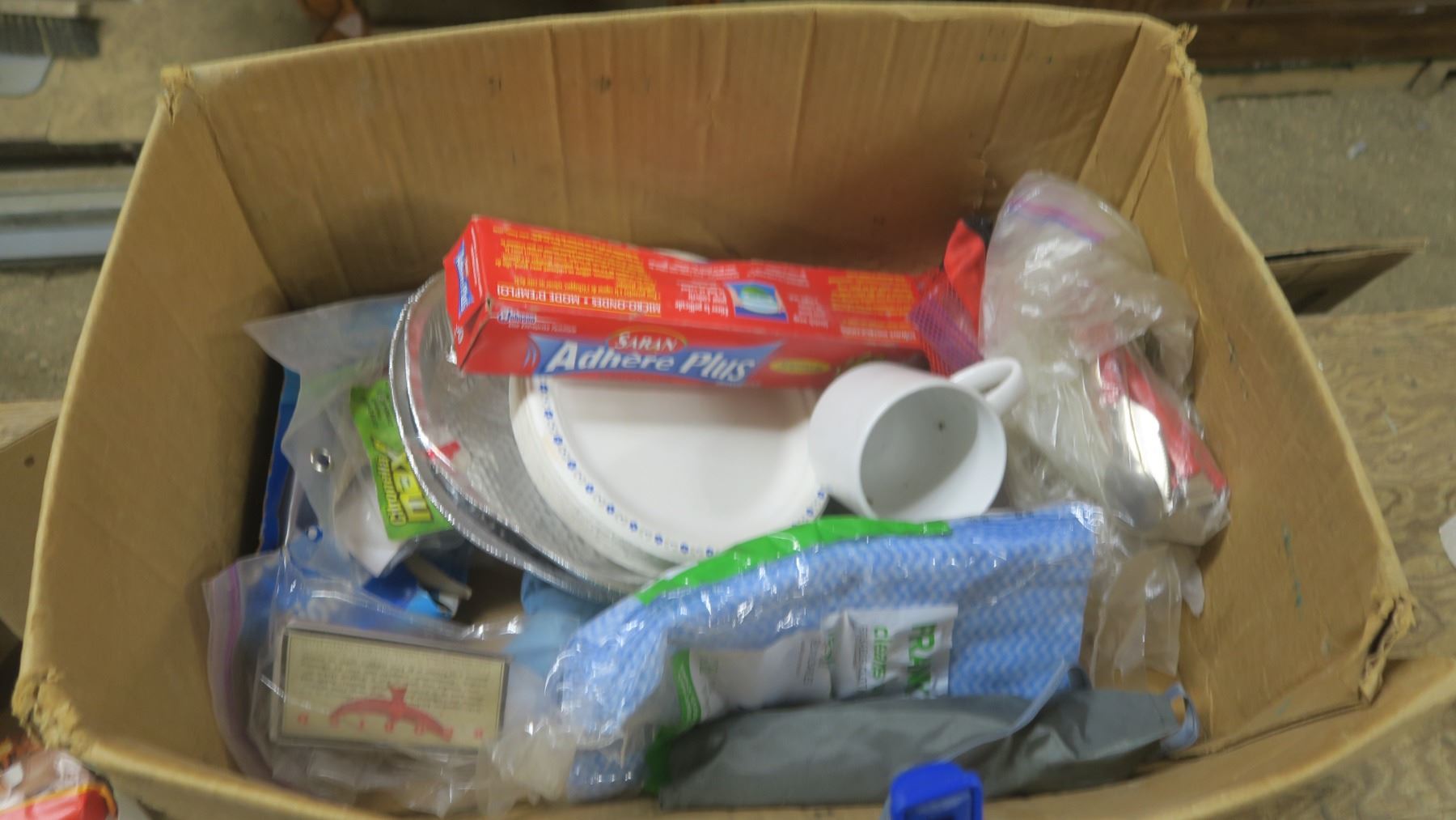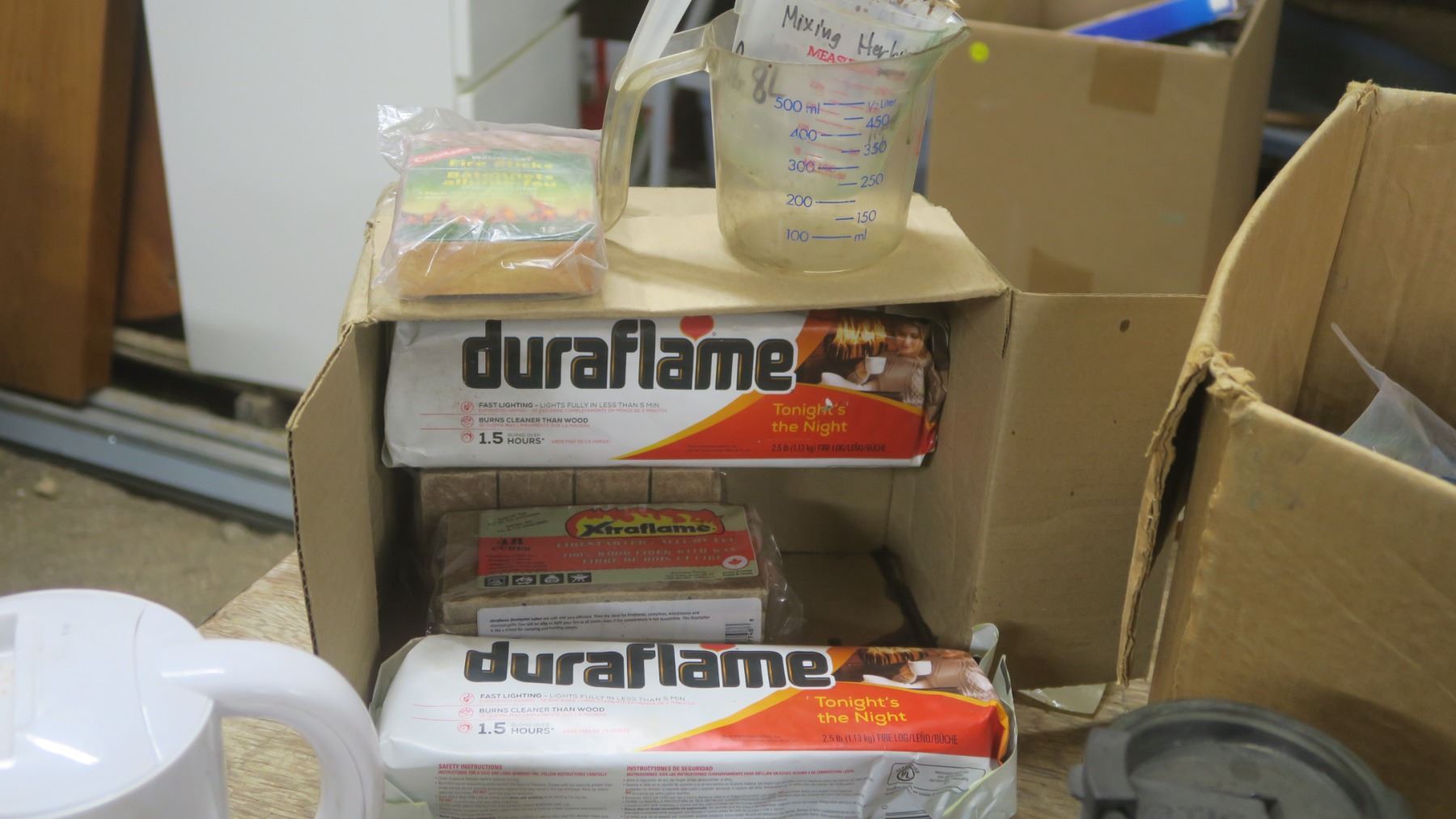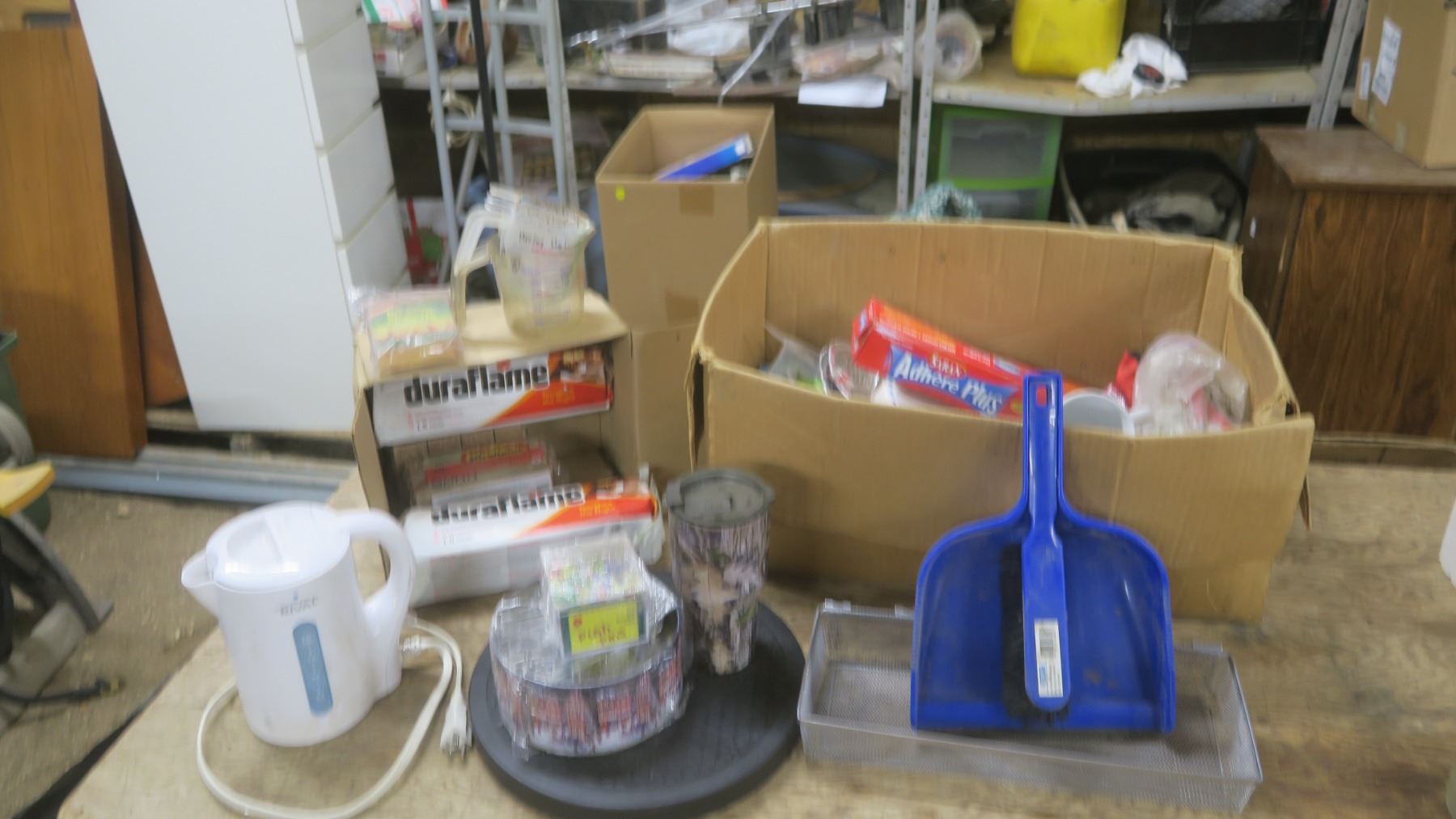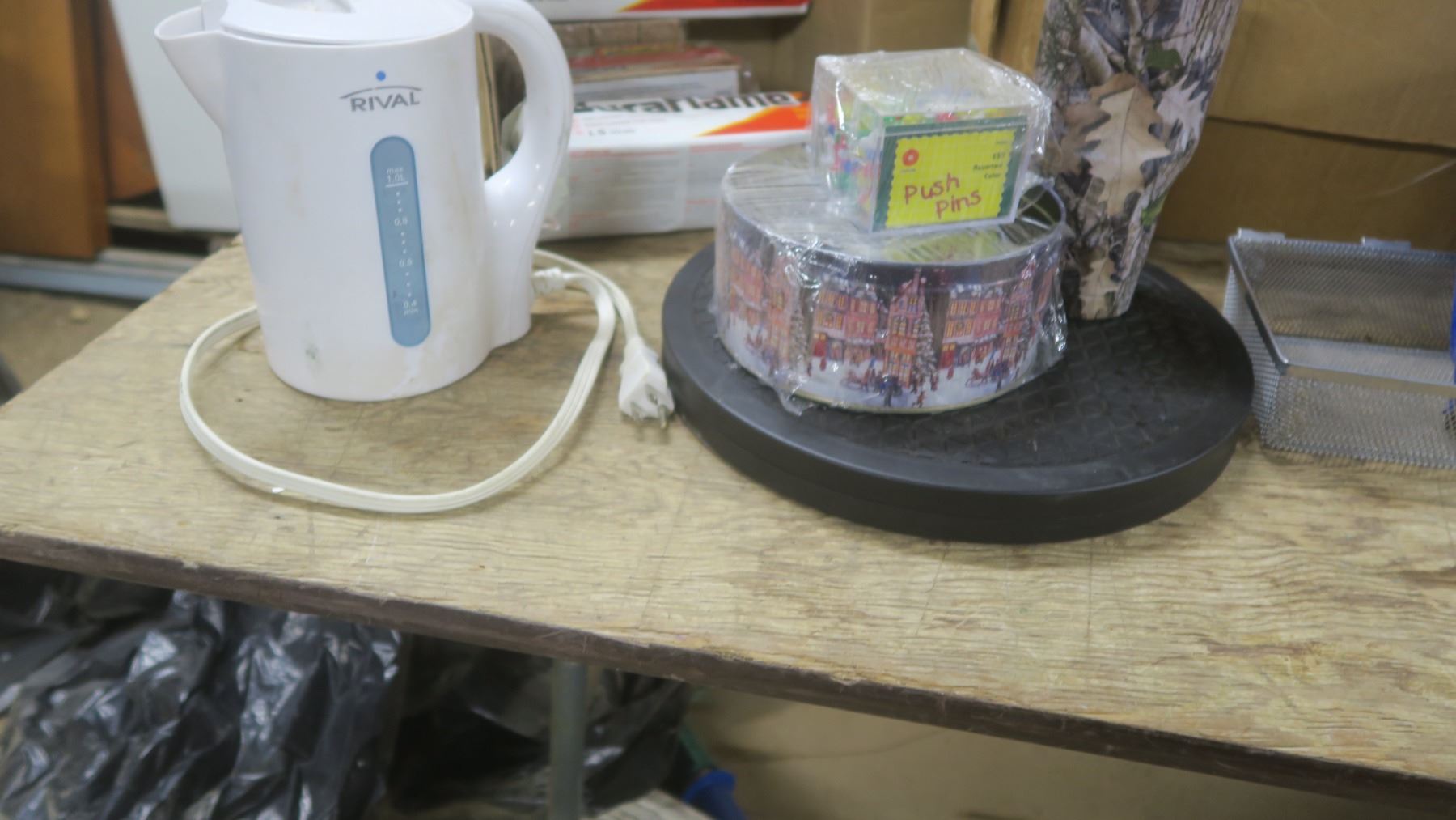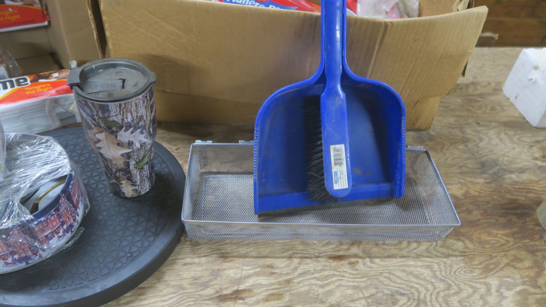 Box of FireStarter Logs / Kettle / Lazy Susan / Reading glasses / Travel Mug / Small Broom and Dustpan