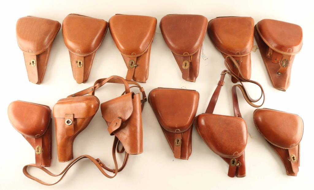 Both repros and originals, Brown leather belt with bayo frog, 3 leather pouches, 2 canvas holsters with shoulder straps, 3 T26 holsters, 4 flare pistol holsters, 5 pigskin holsters, 6 T14 holsters, 7 Papa holsters. And a leather cartridge case unmarked, black leather holds 30.