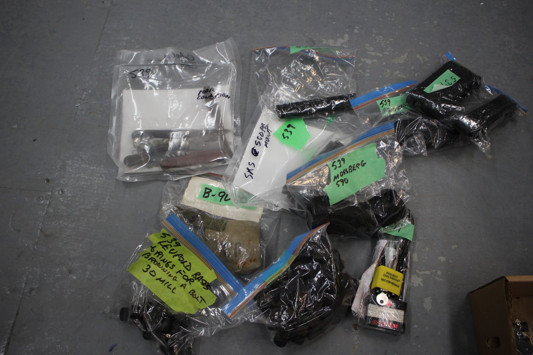 Box of Misc. - 590 Mossberg Grips; Butt Pads; Scope Rings & Bases; Gun Locks; SKS Scope Mount; Bag of Old Knives & 1944 Muzzle Cover