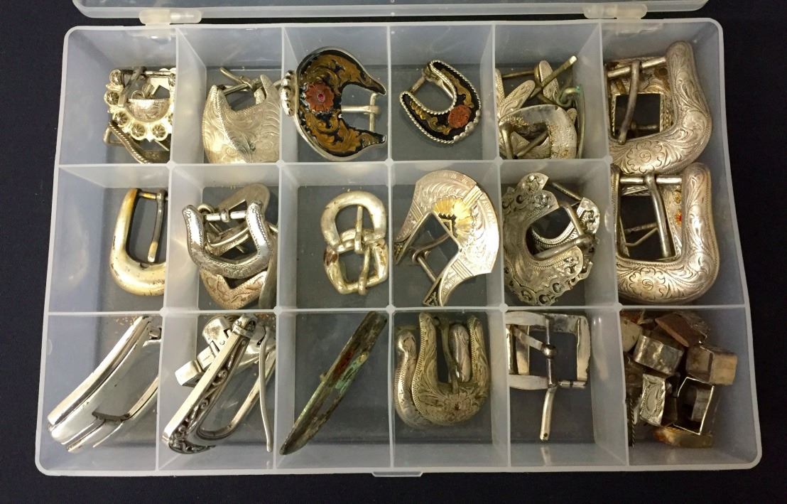 There are numerous buckles for bridles/headstall's in this group. Many are marked as being sterling overlay, there are some matching pairs and just a whole lot of parts and pieces in this box. Several have recognizable maker’s marks. A lot of value here. Please look closely at pics as they are an important part of our description. Shipping: There will be a $7 handling / packaging fee for shipping this lot. The actual cost of postage will be added on top of that.