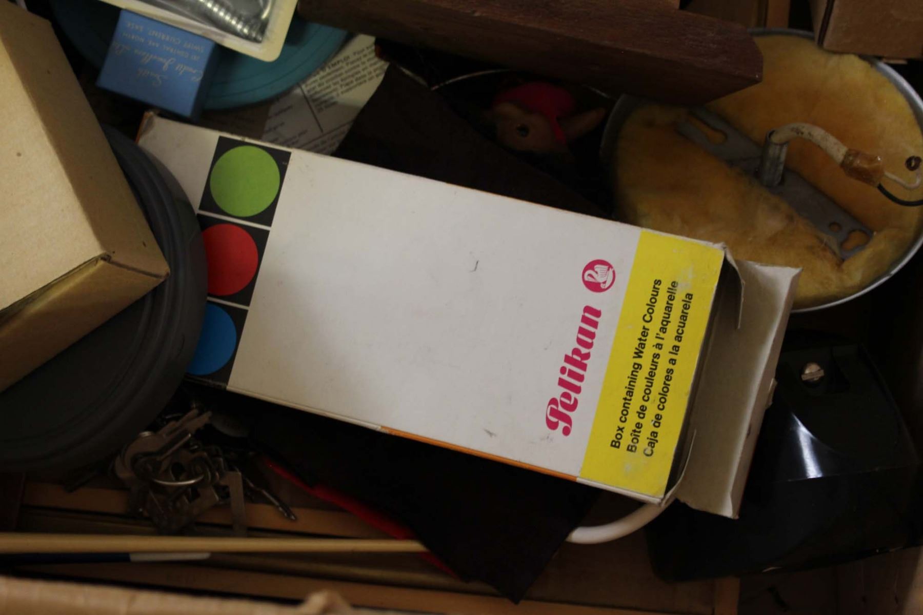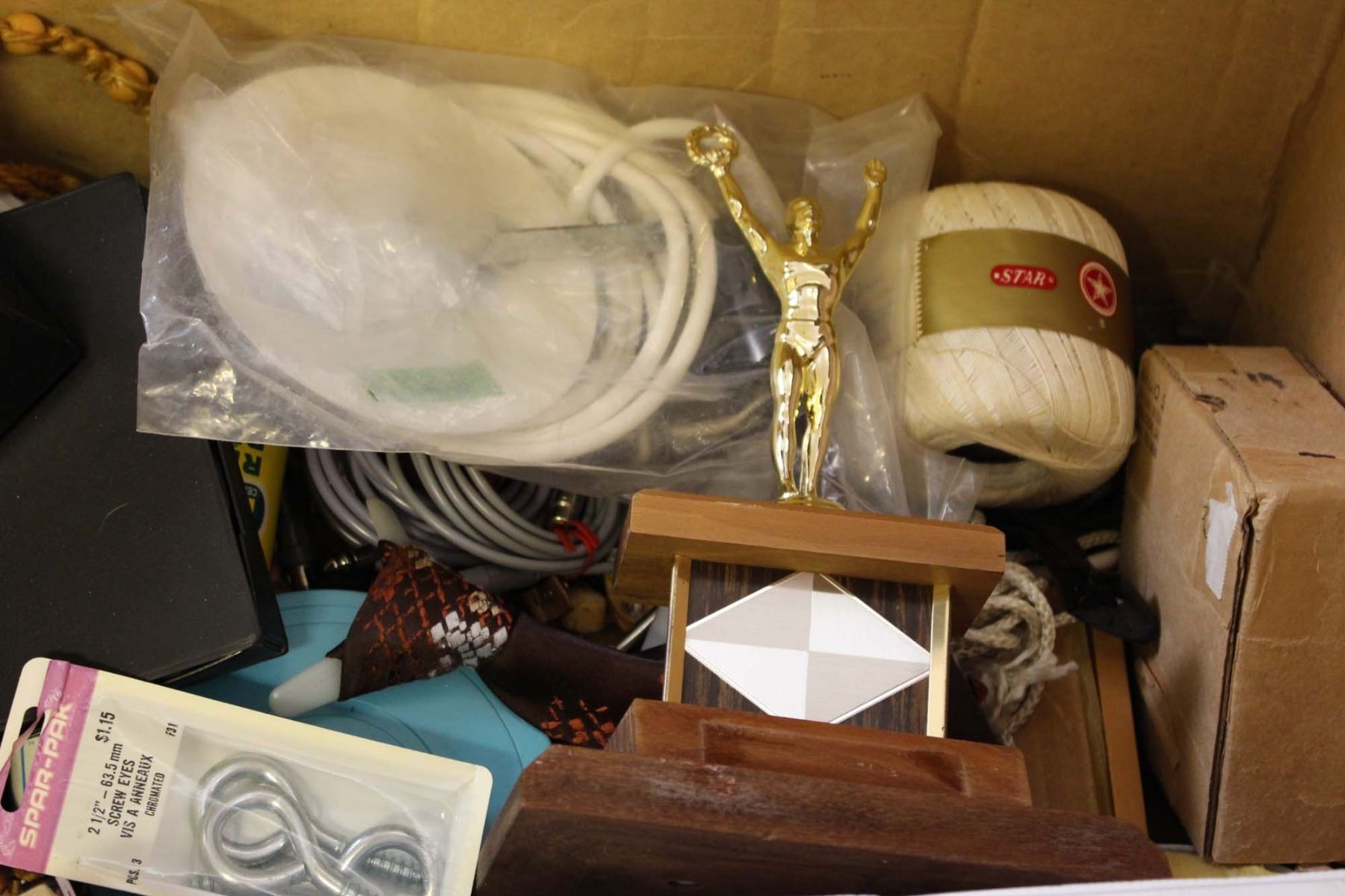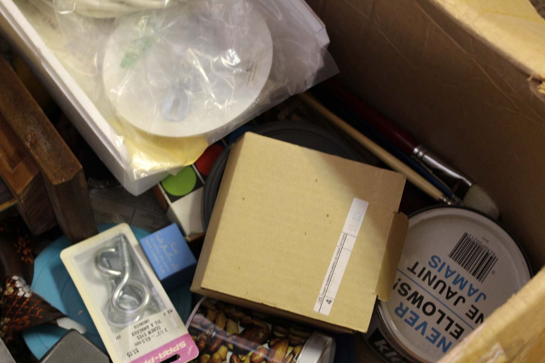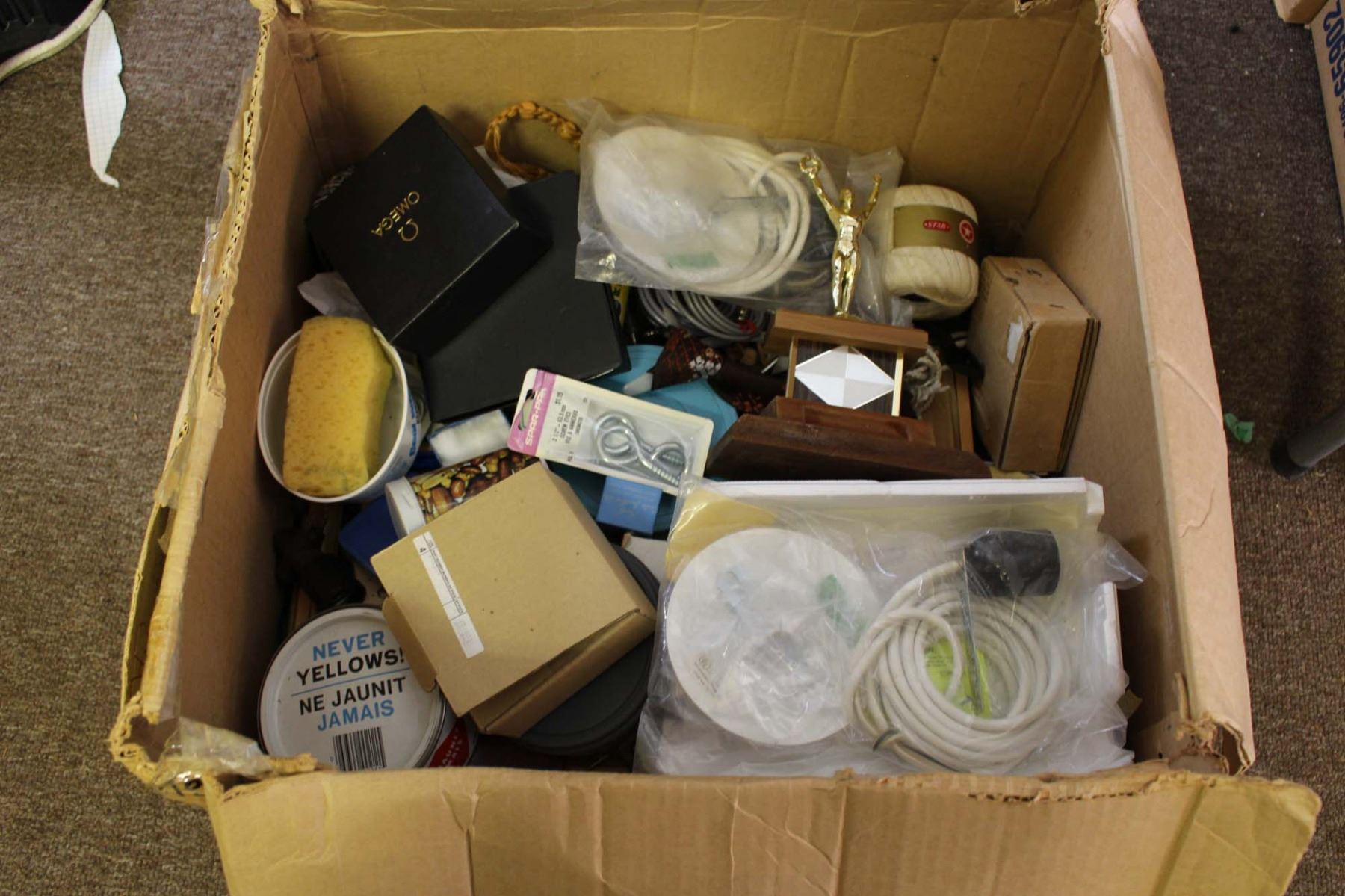 Box of Misc (Cords, Paint Brushes, Containers, Pins)