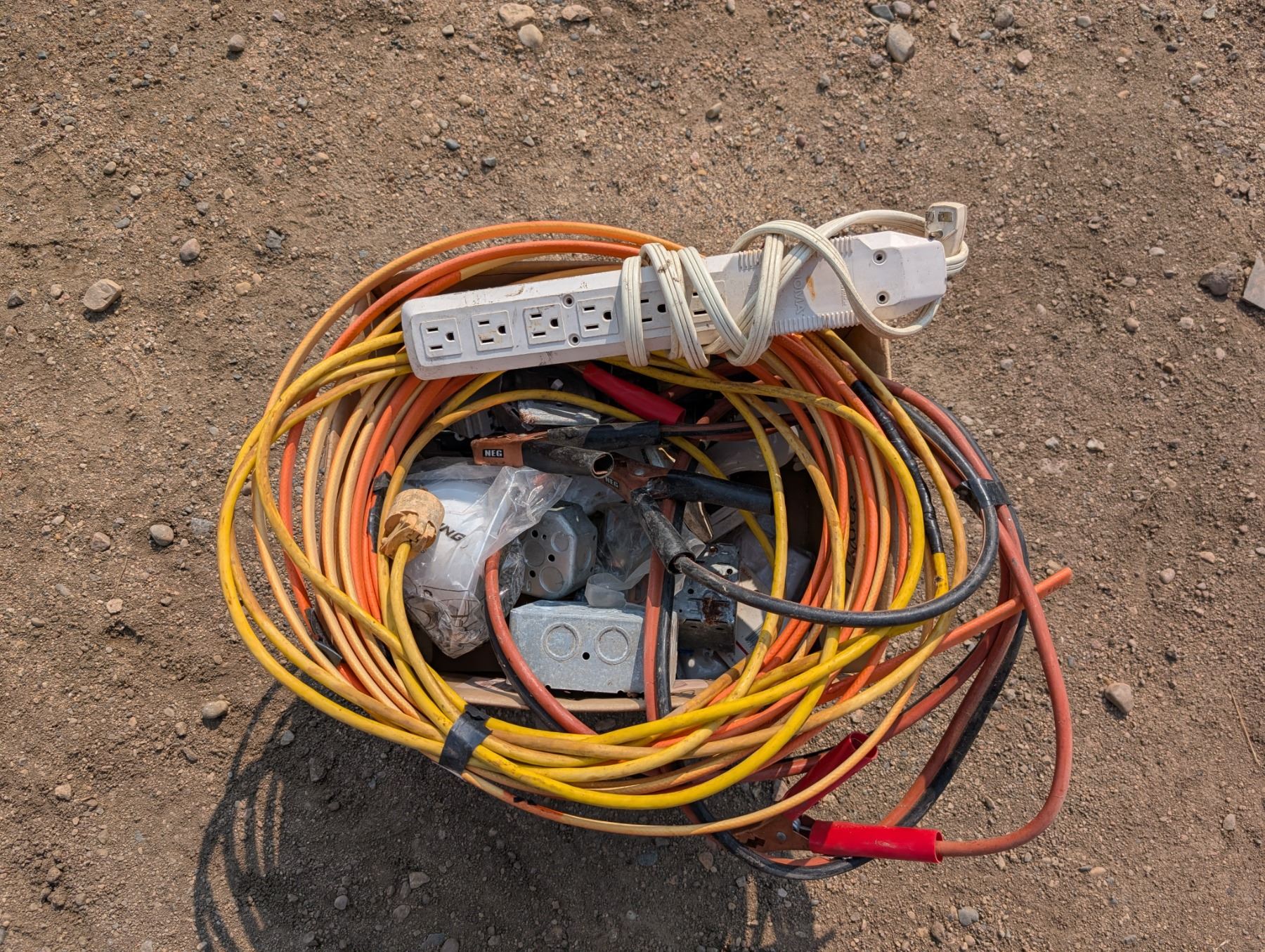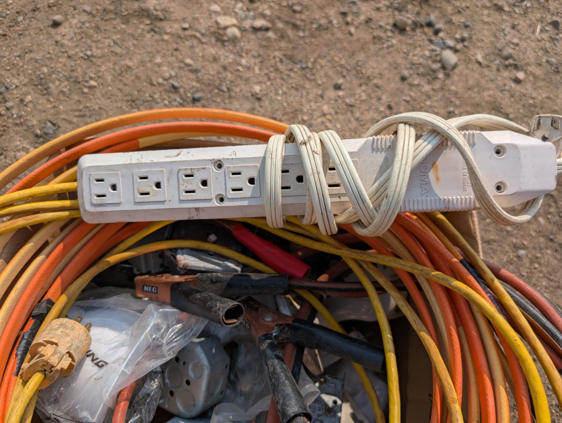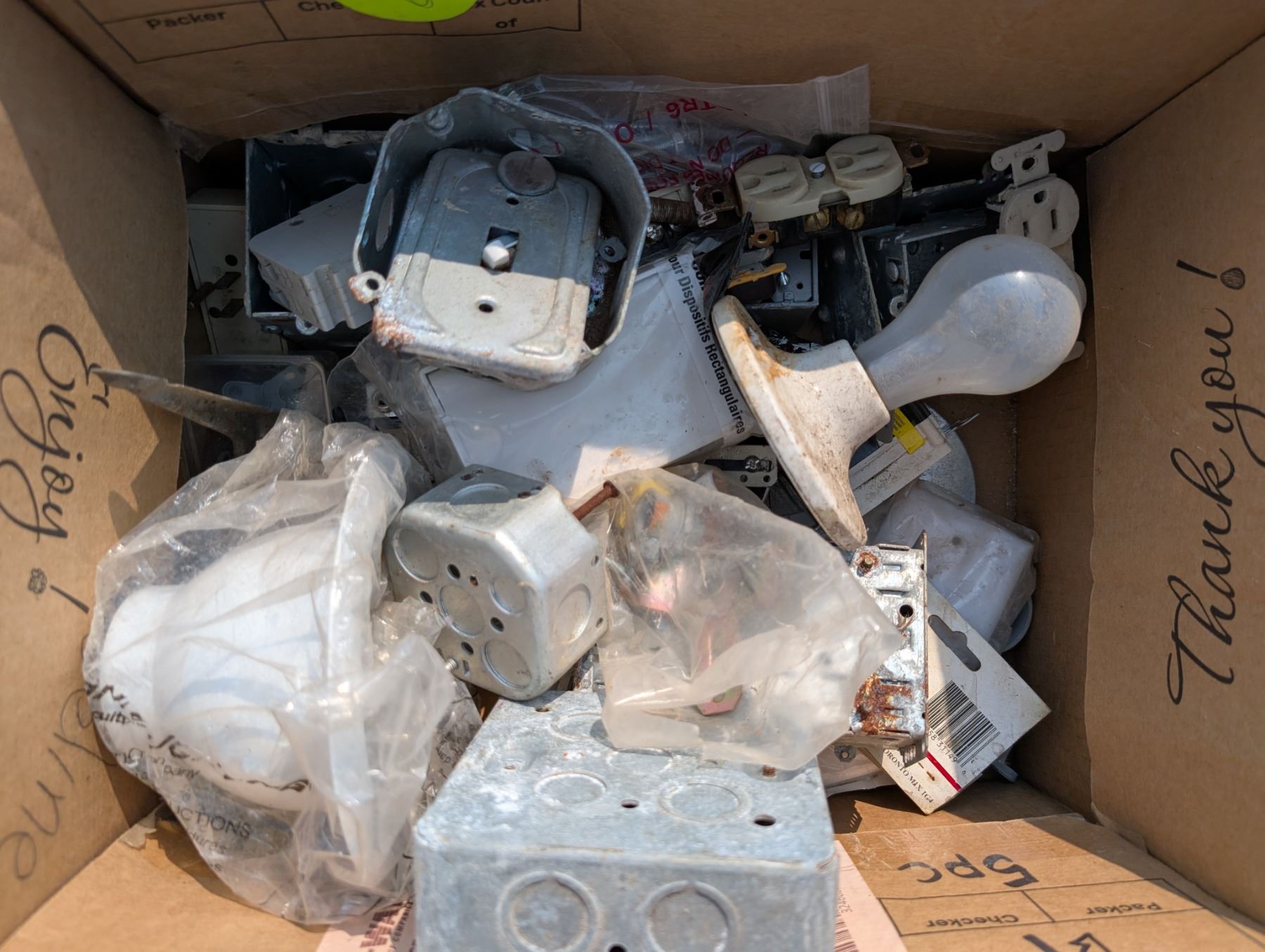 Box of Misc. Electronical items (Cords, Block, Light Switches, Bulbs, etc.)