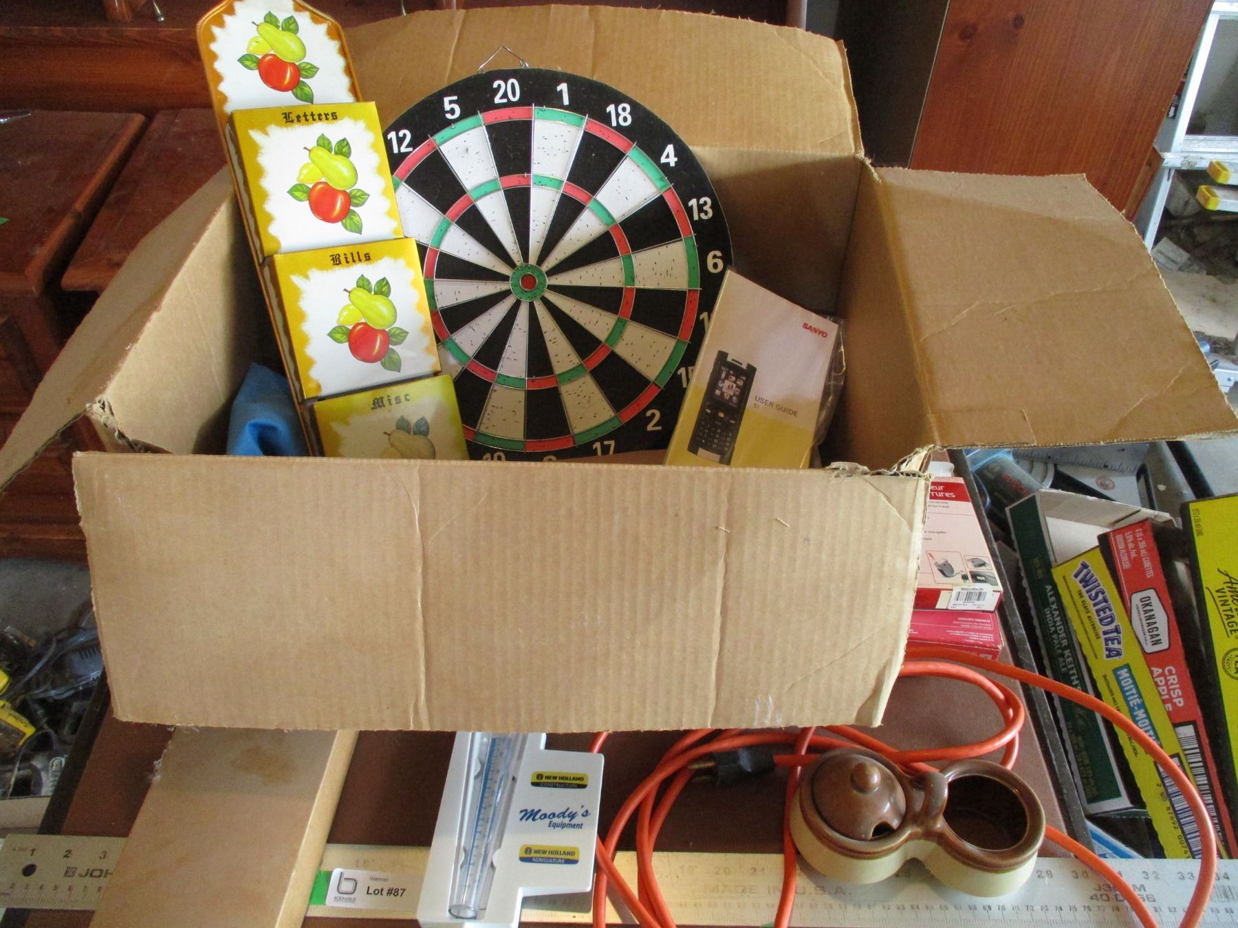 Box of Misc. Items (Extension Cord, Dart Board, Letter Holder)