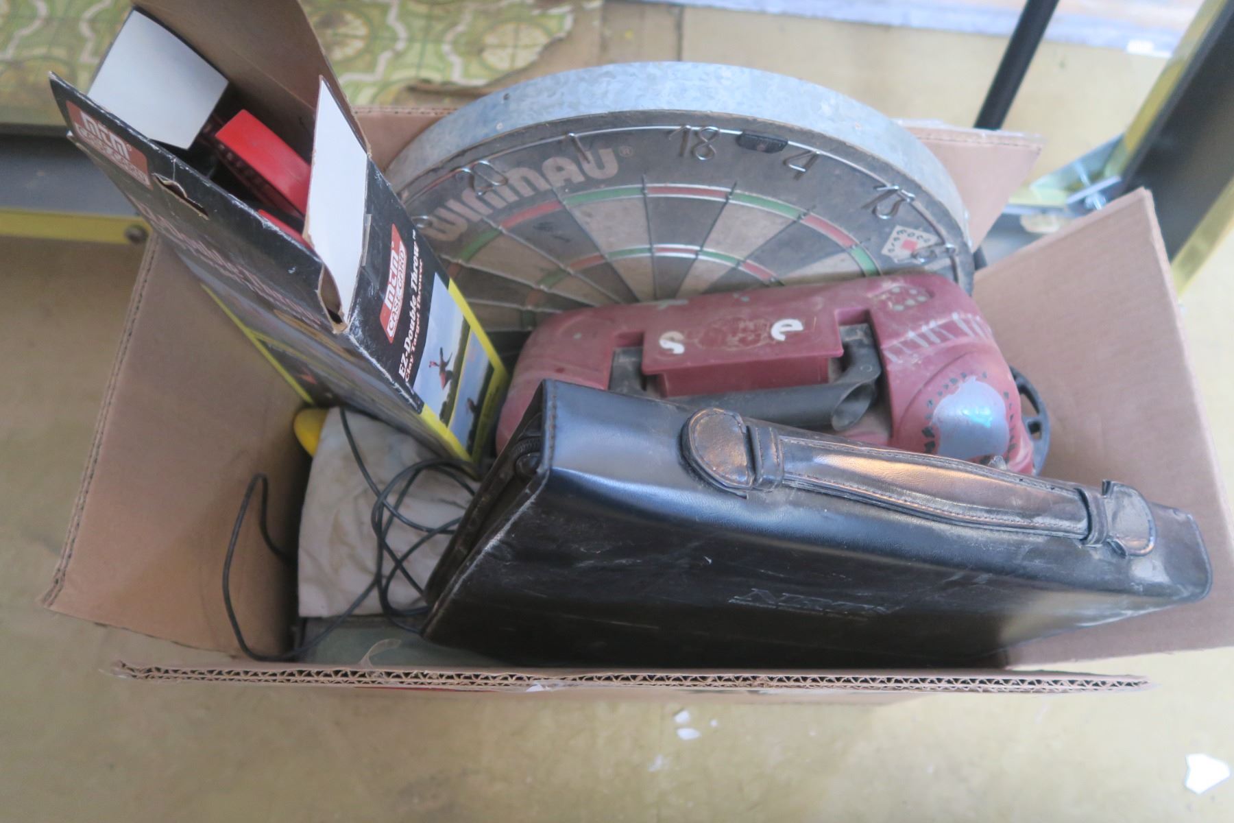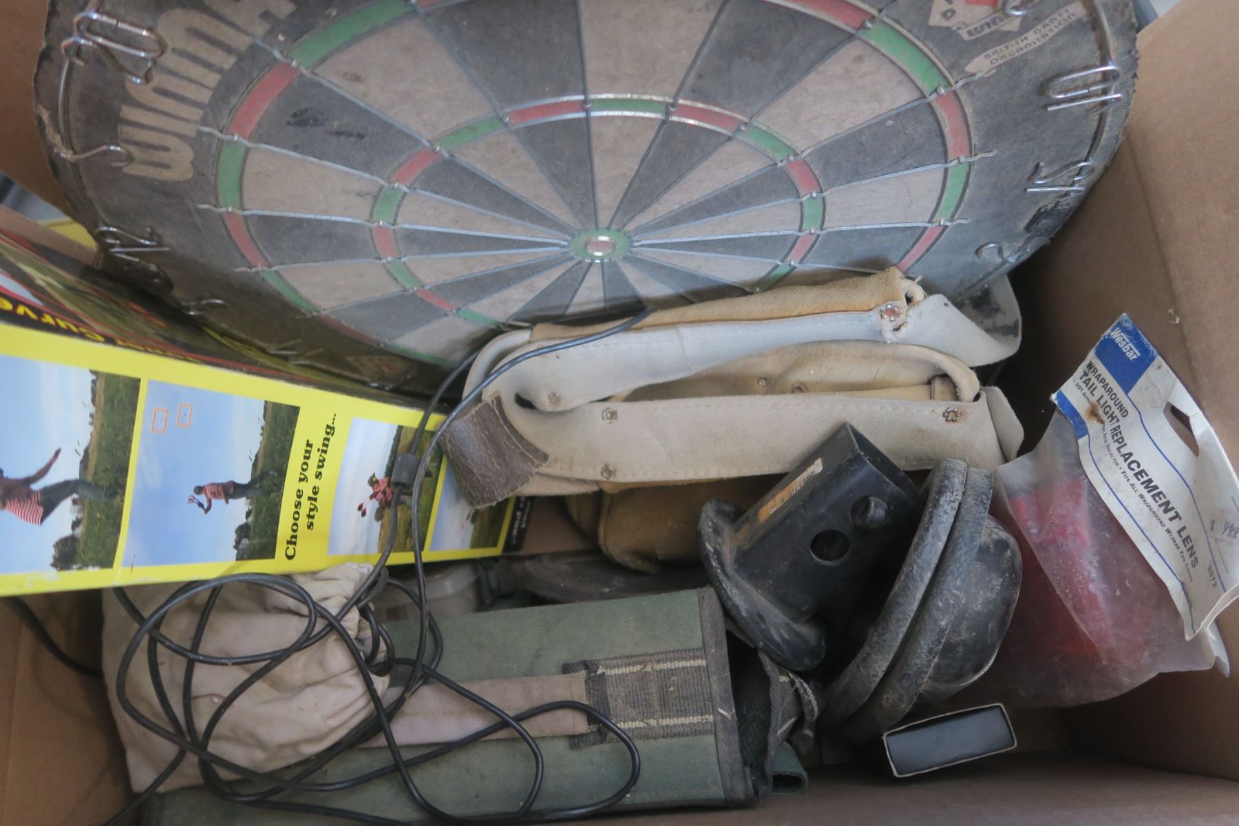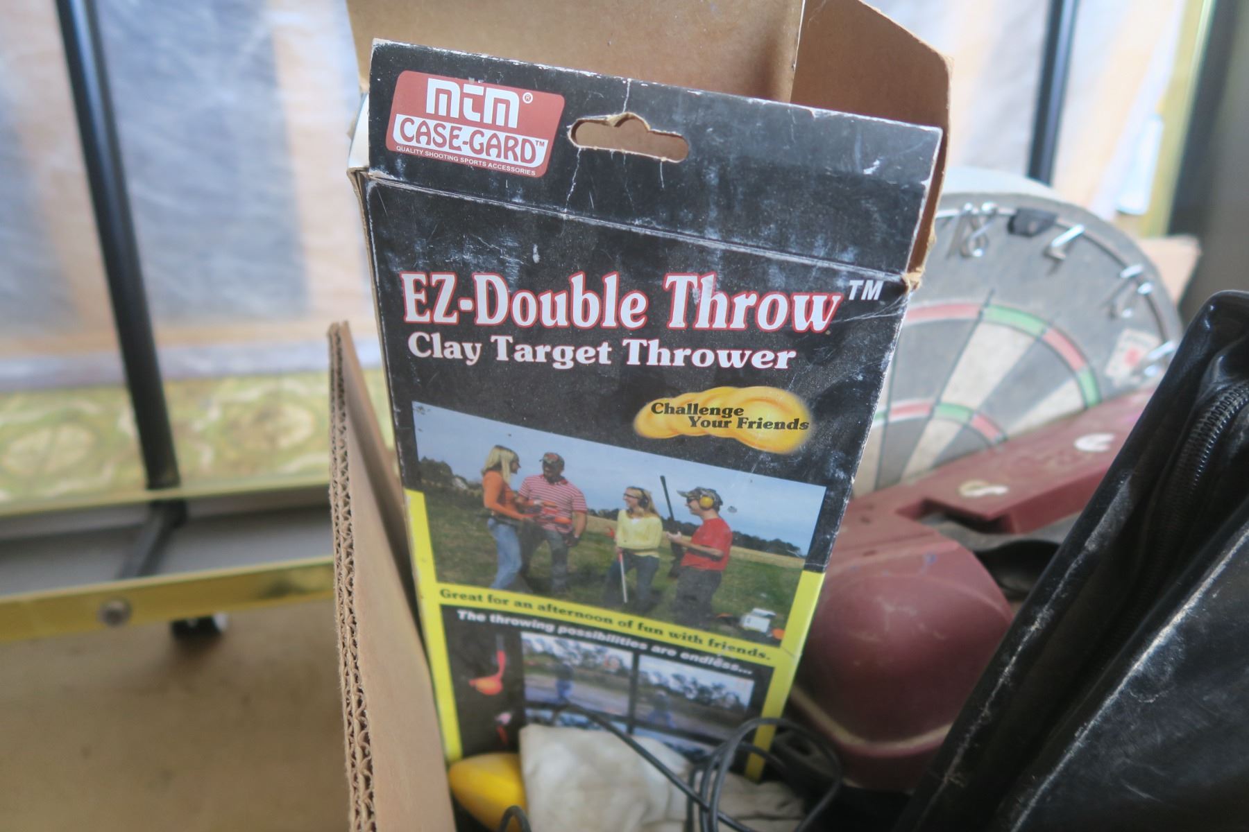 Box of Misc. Items Including Dart Board, & Clay Target Thrower