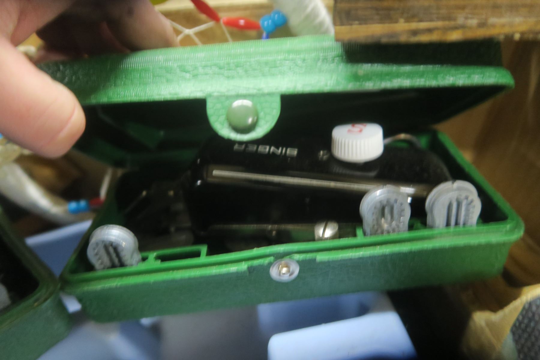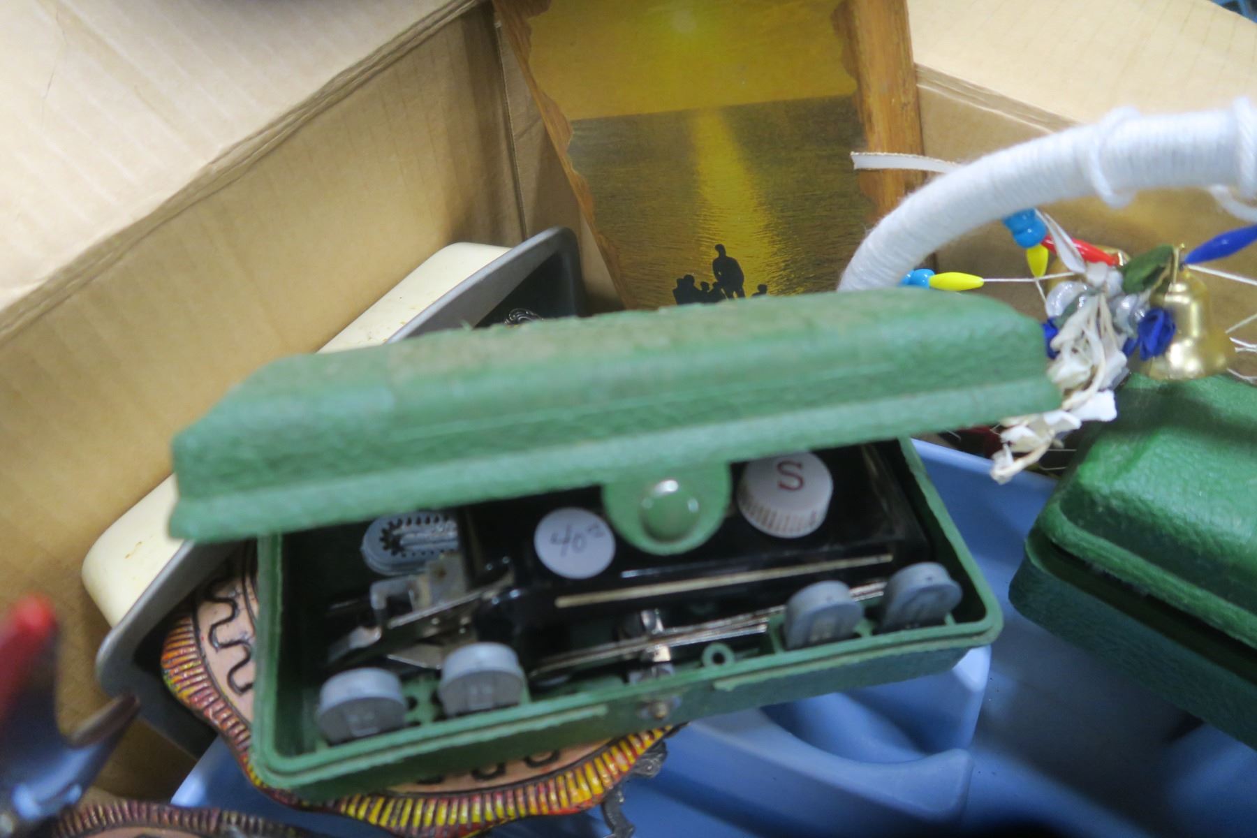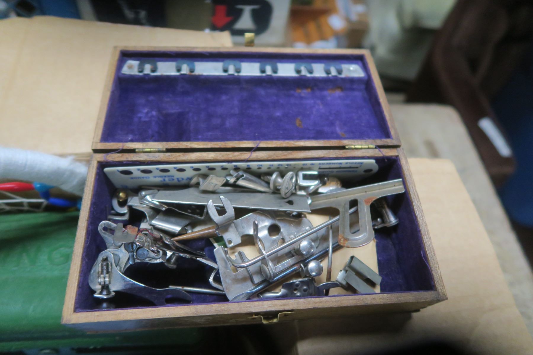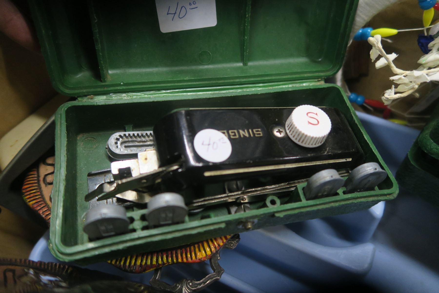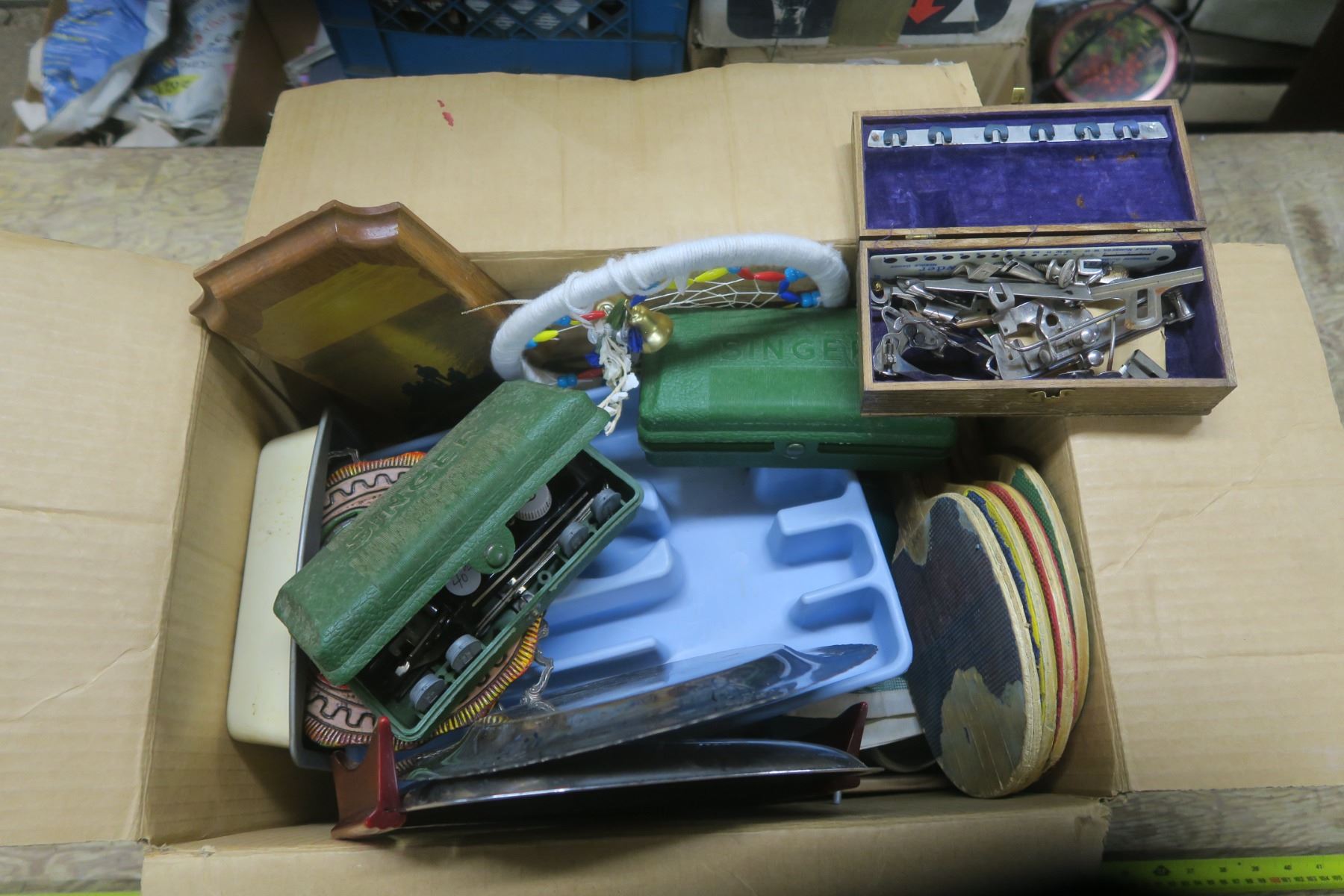 Box of Misc. Items Including Ping Pong Paddles Singer Sewing Machine Parts