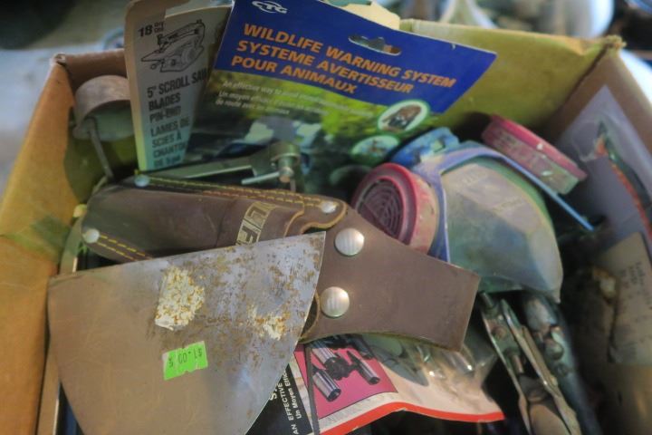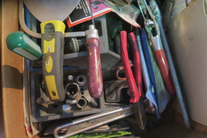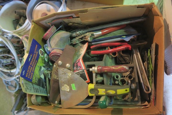 Box of Misc. Items Including Scraper, Adjustable Wrenches and More