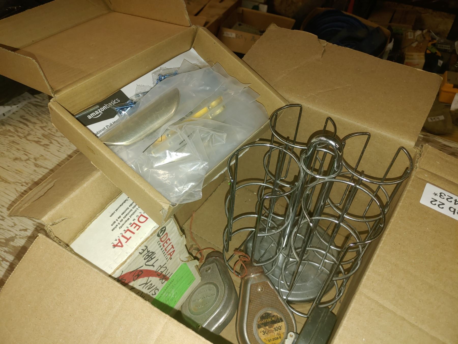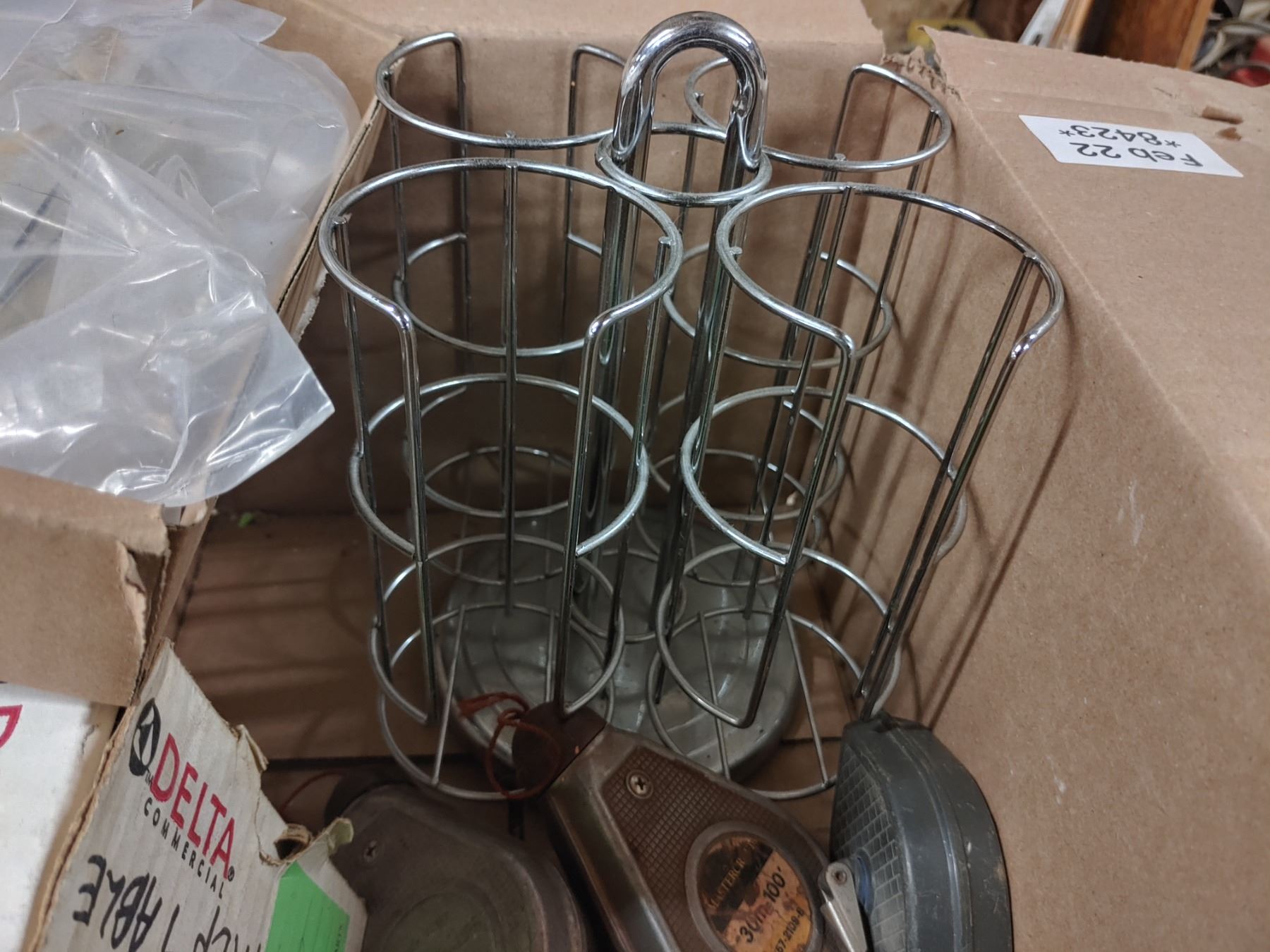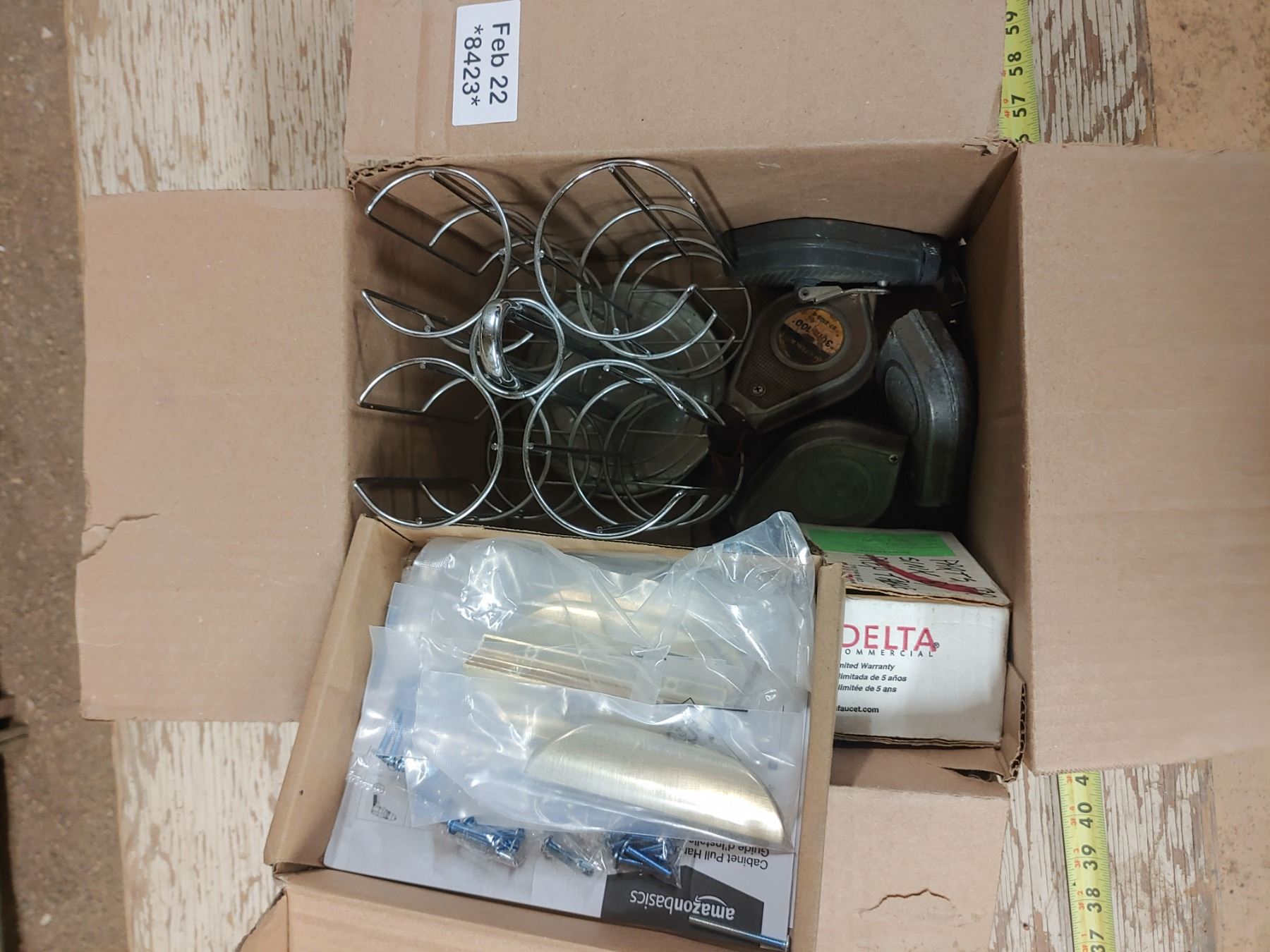 Box of Misc. Items Tassimo Rack, Door Handles, Chalk Line