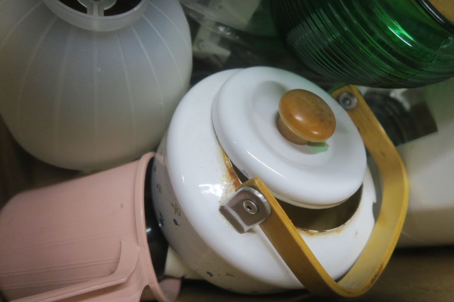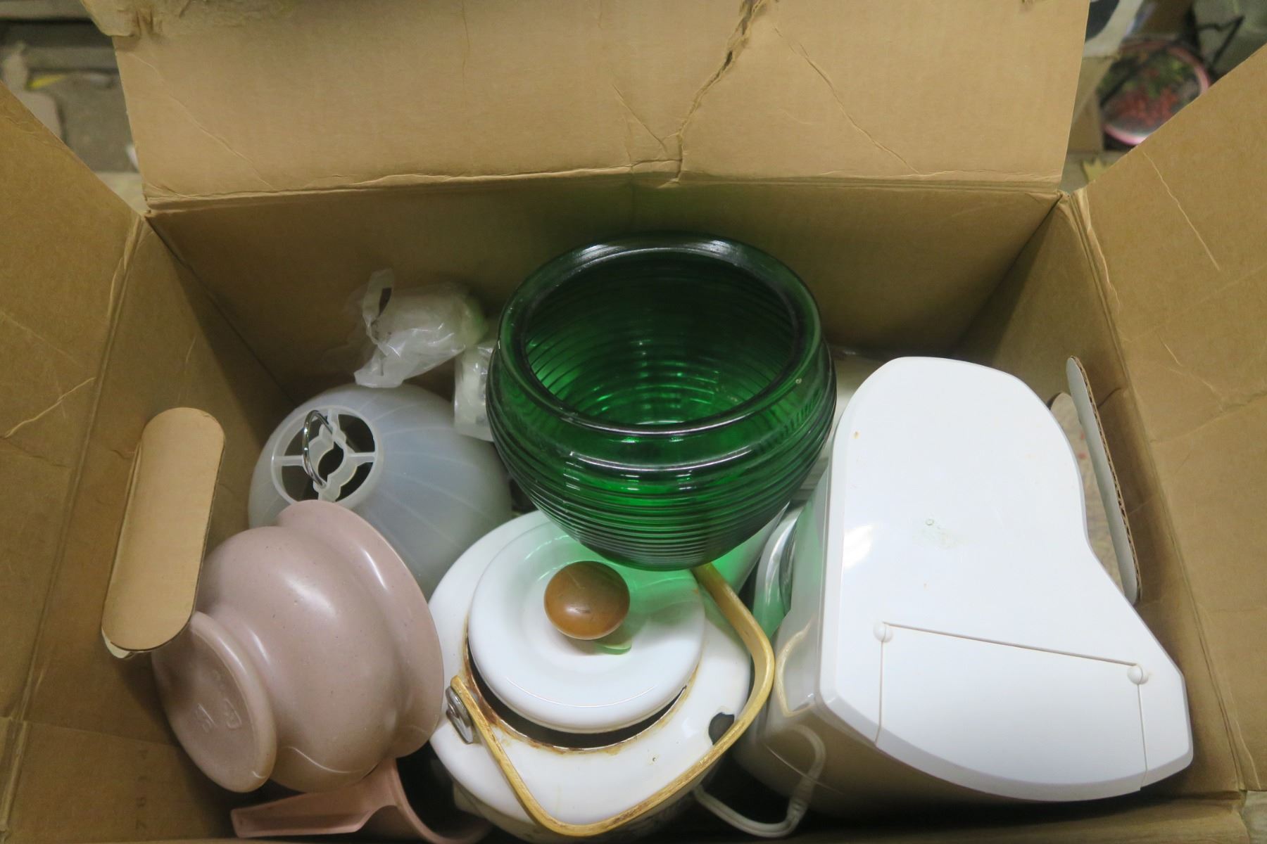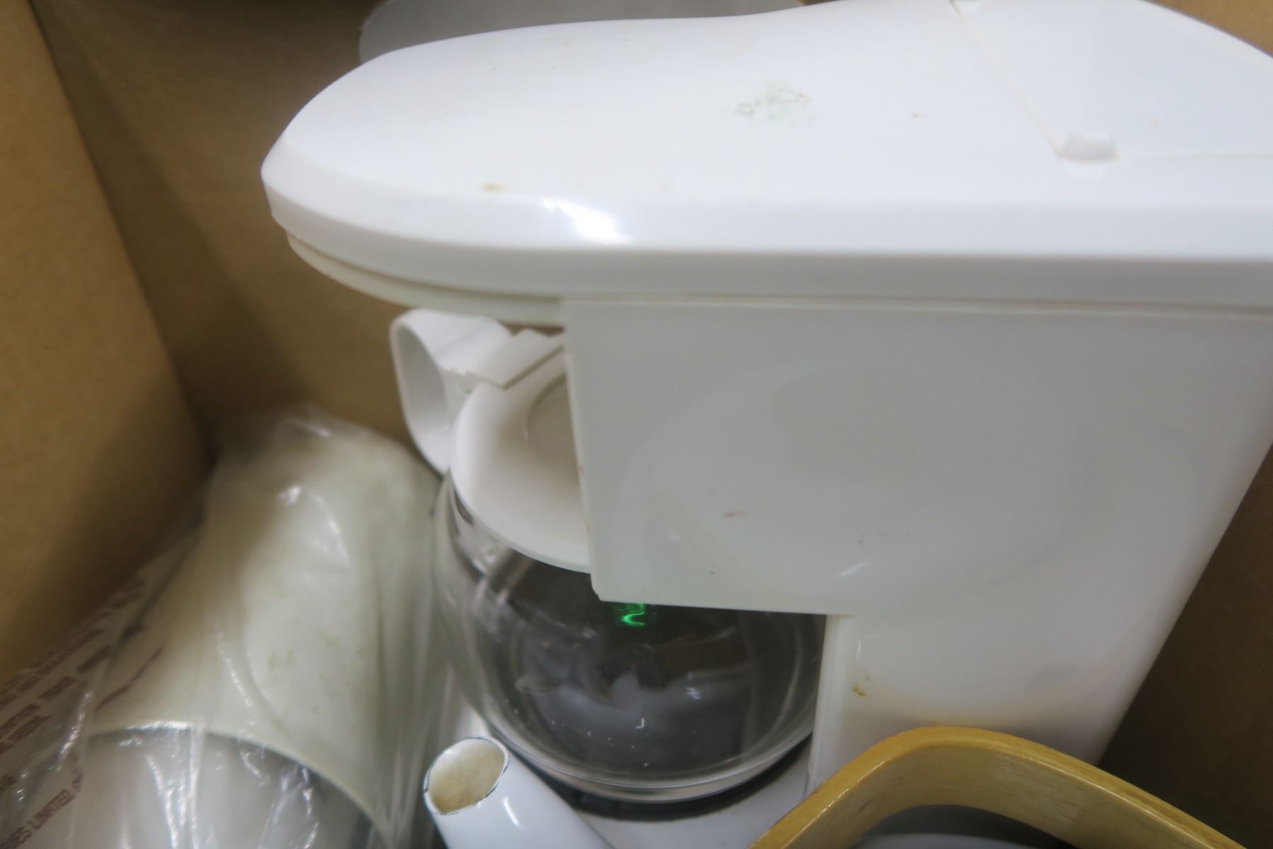 Box of Misc. Kitchenware Including Coffee pot, Teapot and Glass Bowl