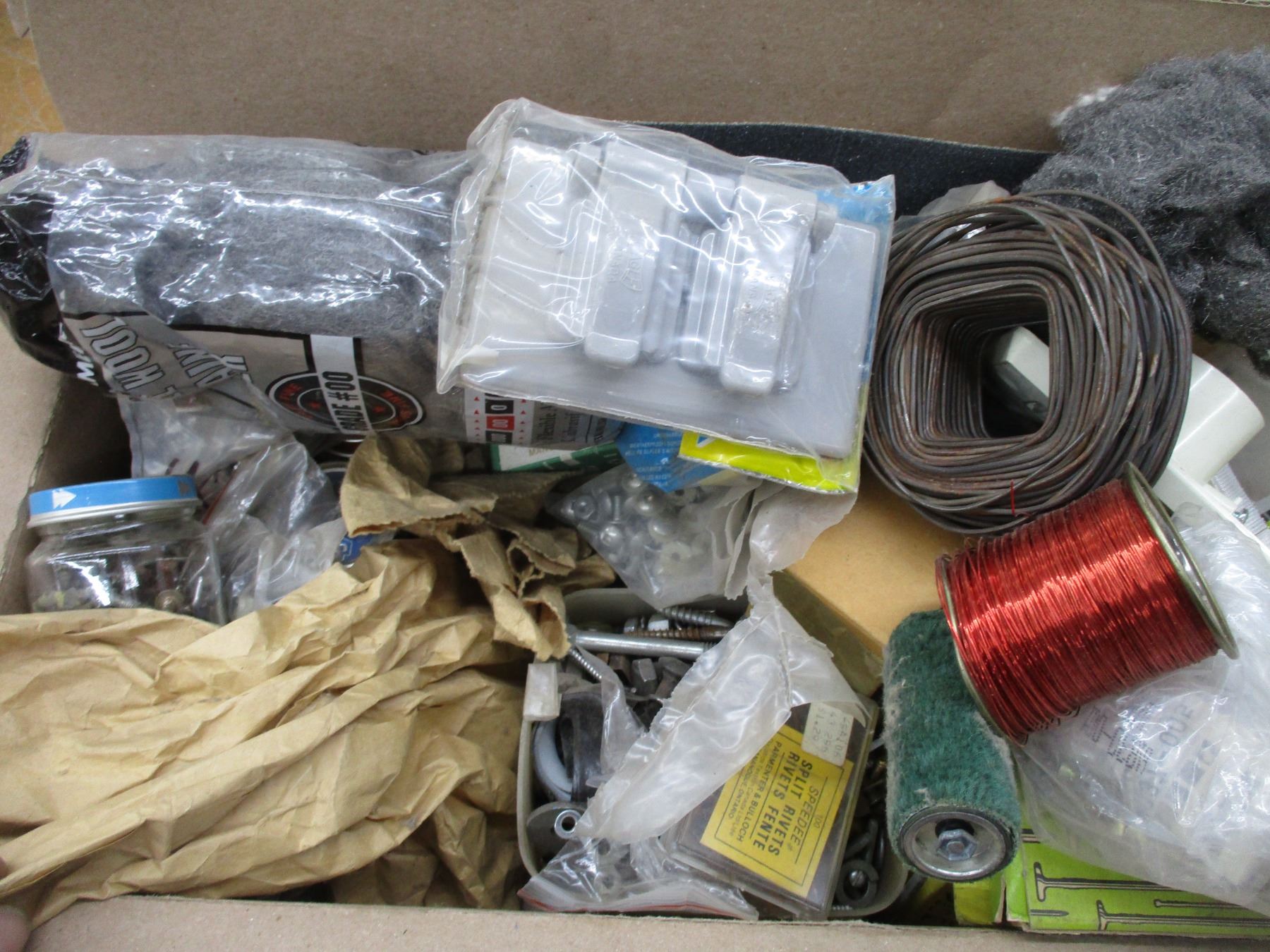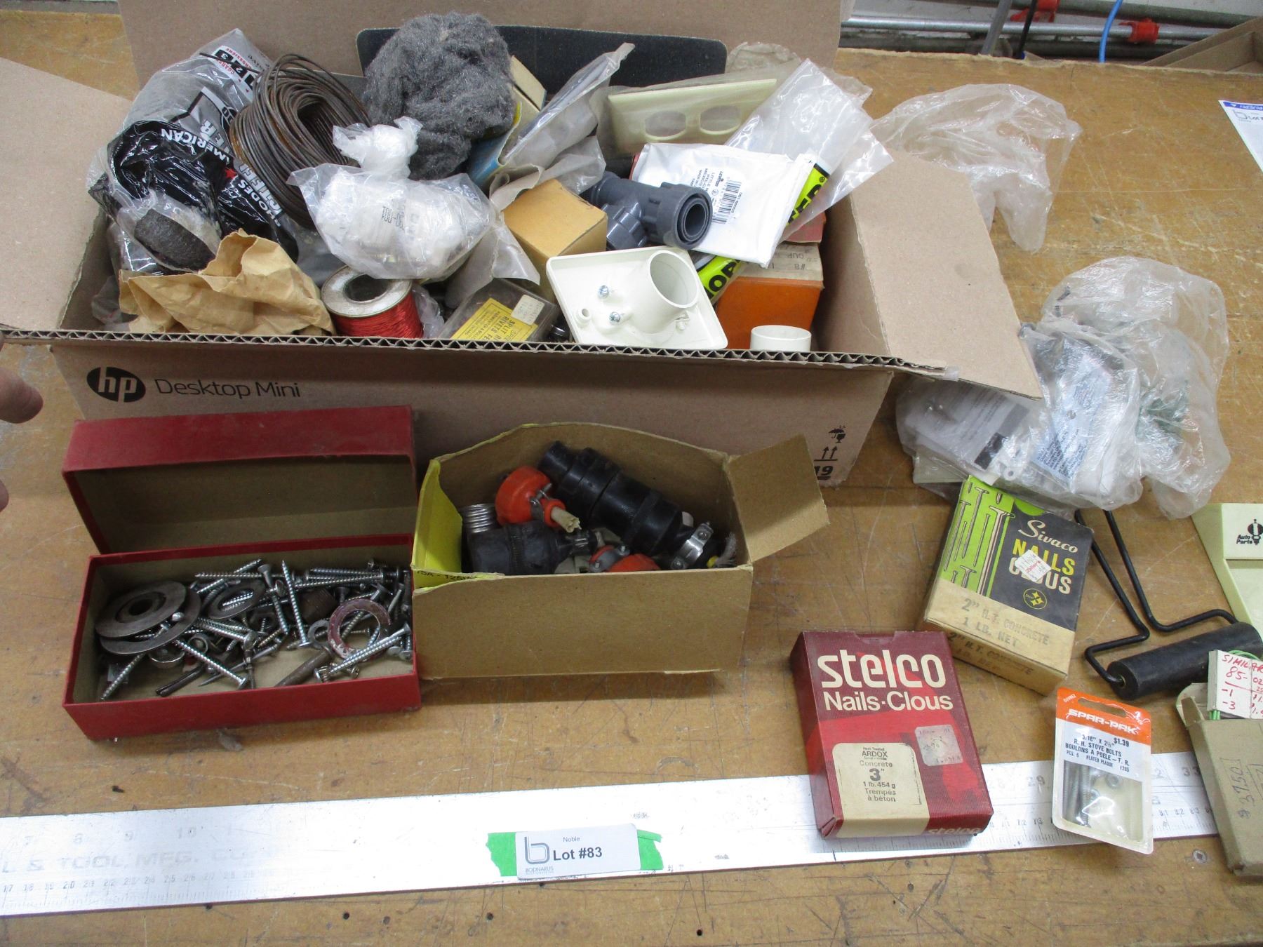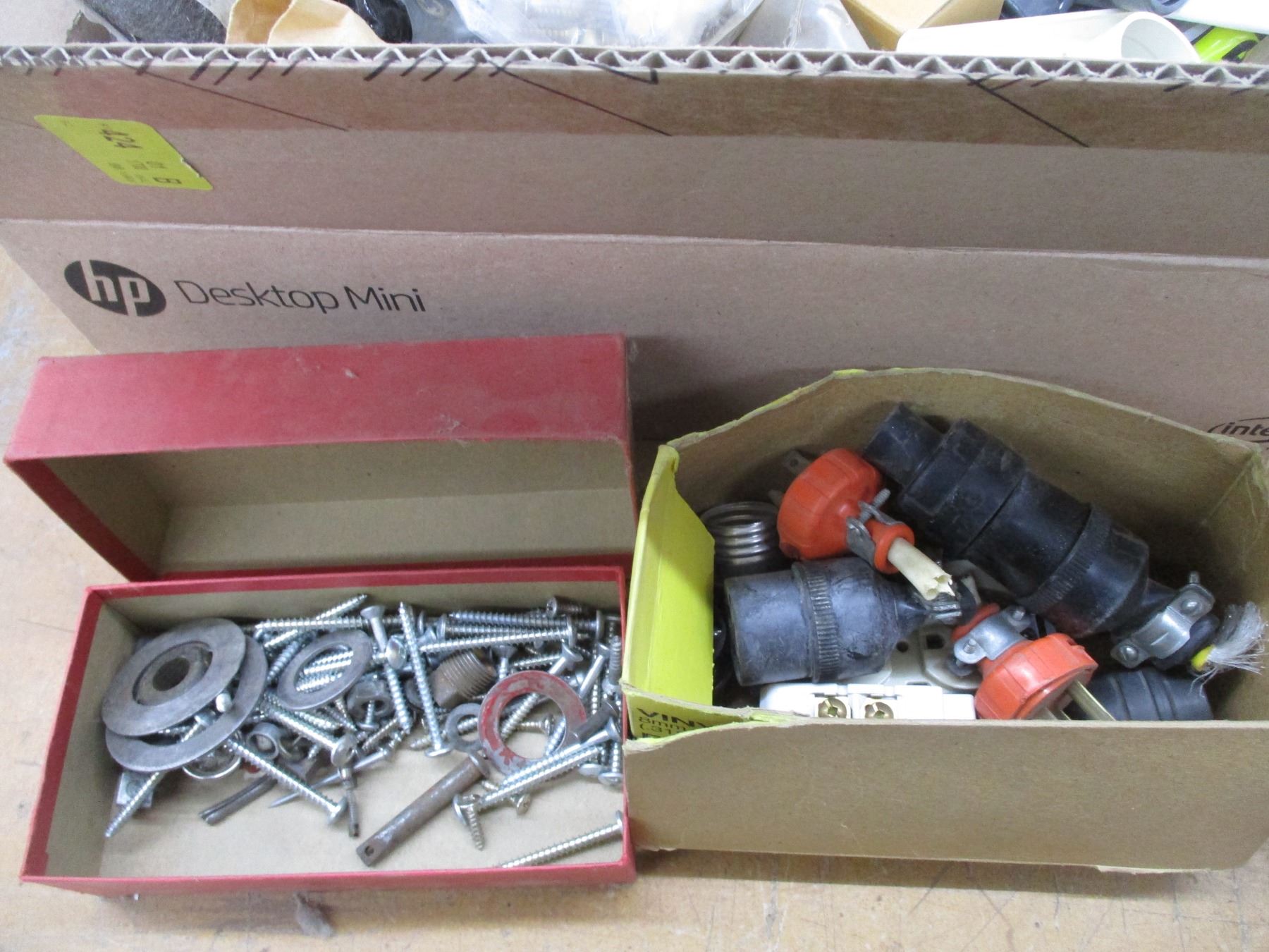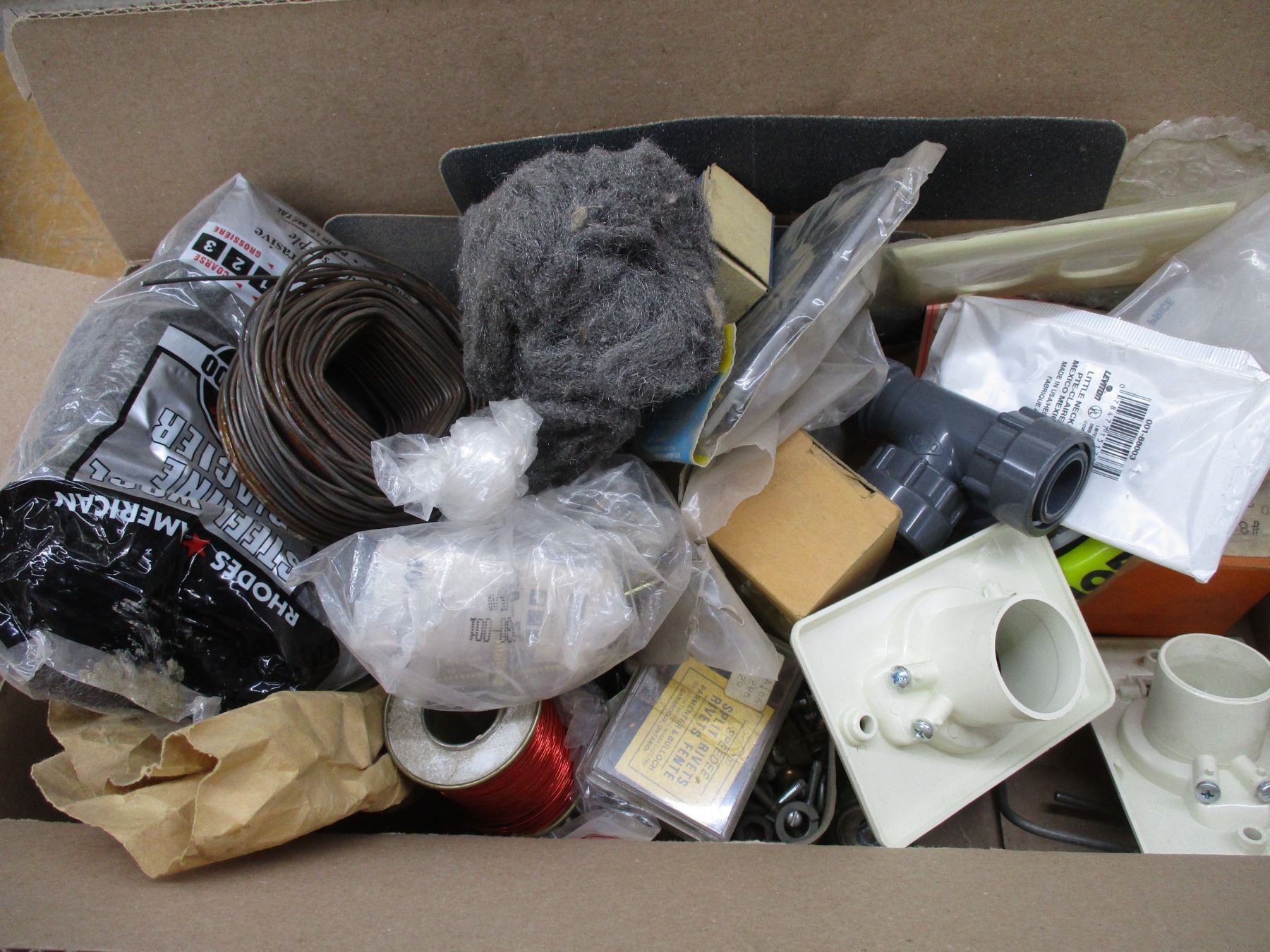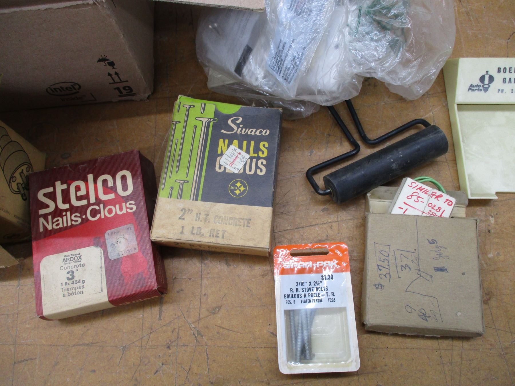 Box of Misc. Shop Items - Nails, Sandpaper, Bolts, Screws, J-Roller, Electrical Plugs/Plates etc.