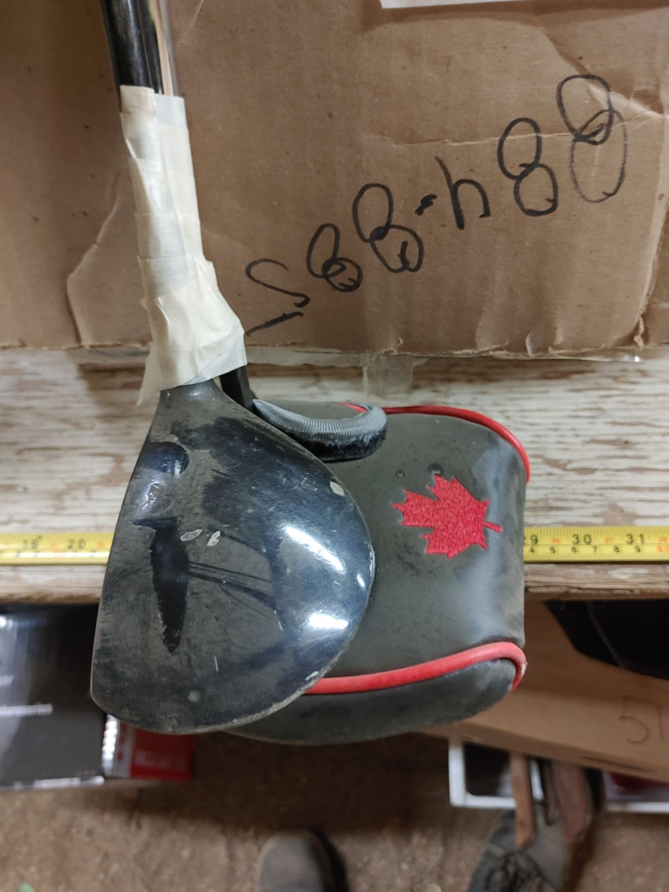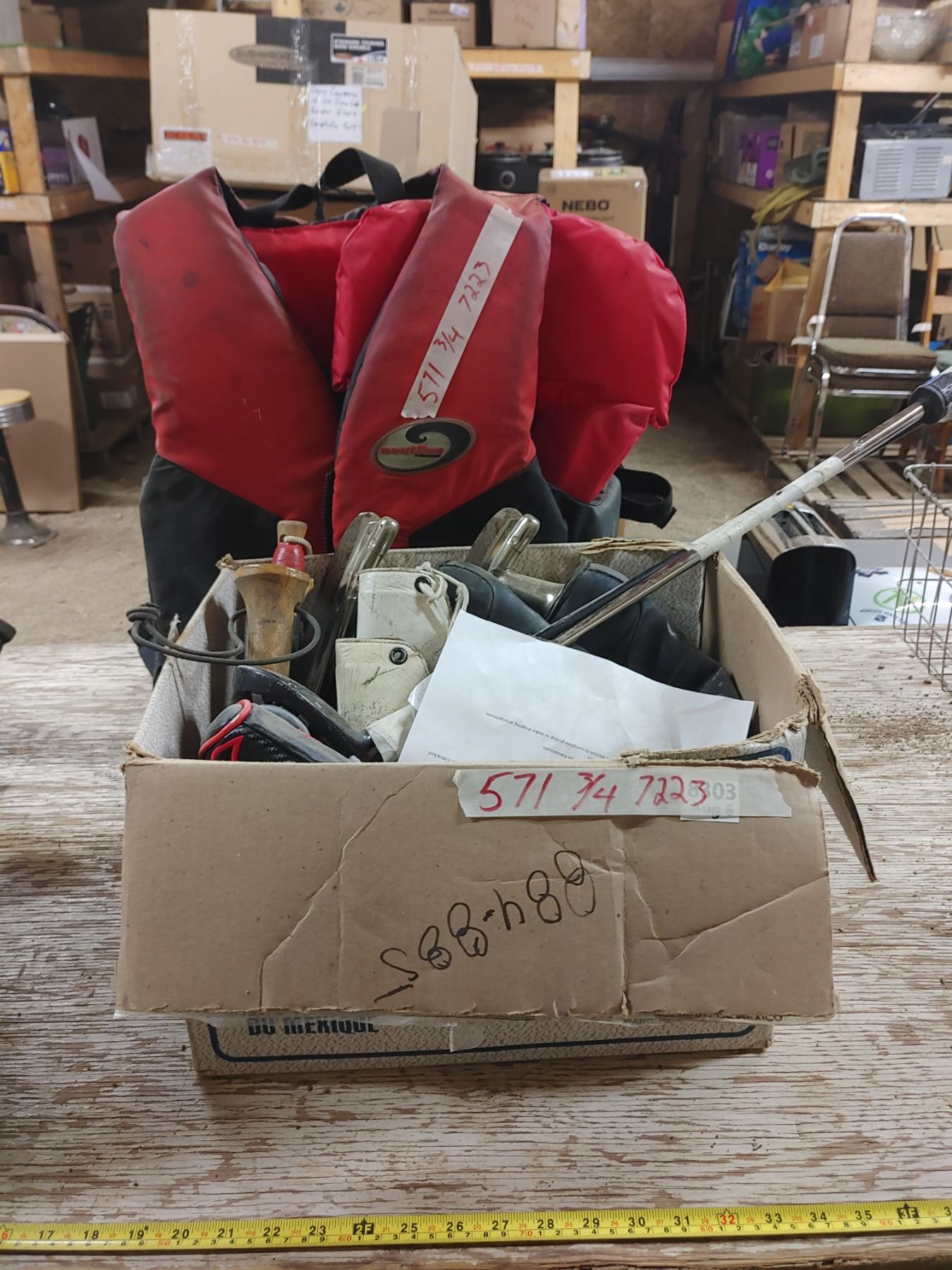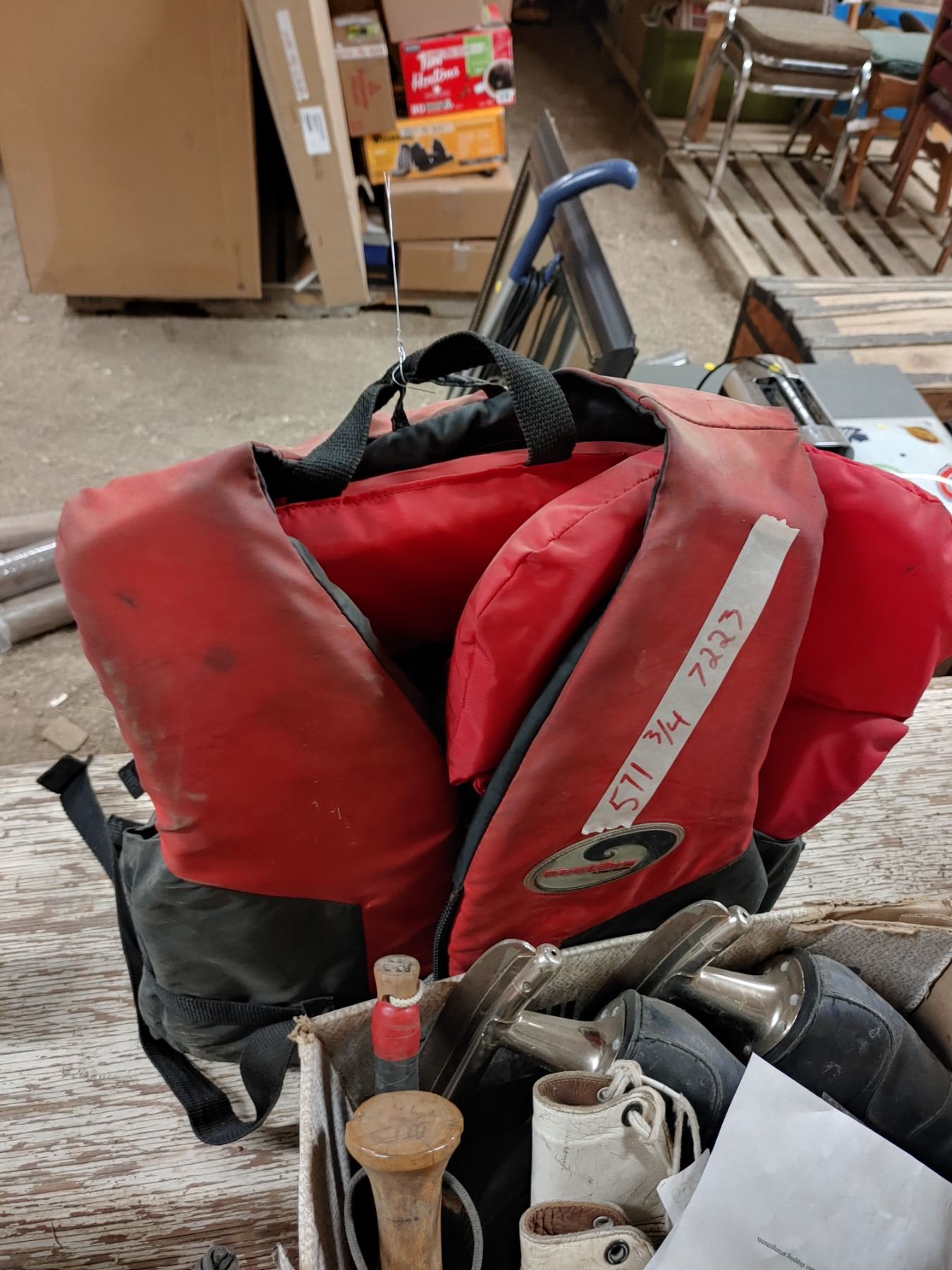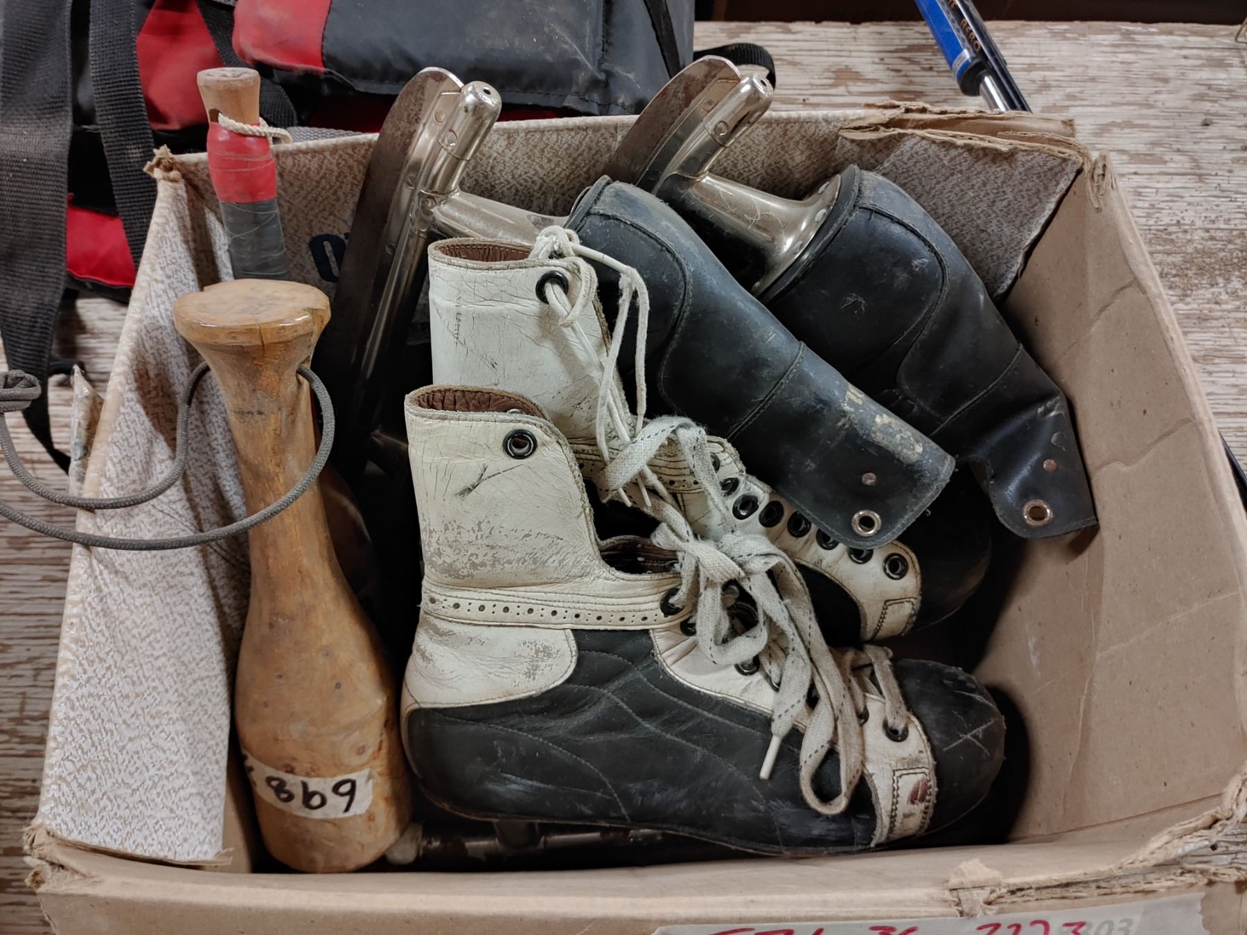 Box of Misc. Sporting Goods, 3 Life Jackets, 2 Golf Clubs, 2 Pairs of Ice Skates